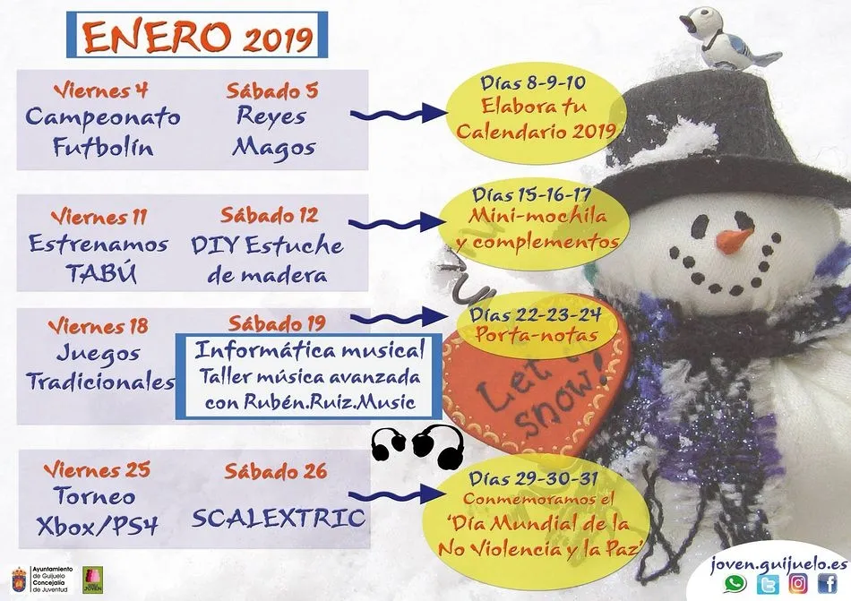 La programación de enero, que ya comenzaba el pasado mes de enero con un campeonato de futbolín y la fiesta del Día de Reyes, continúa esta semana con un taller en el que los chicos podrán a lo largo de esta semana elaborar su propio calendario para 2019, la actividad se desarrollará hasta mañana, jueves 10 de enero. Ya para el fin de semana, es momento de estrenar el juego Tabú, el viernes 11, y un taller que dará forma a un estuche de madera el sábado 12.