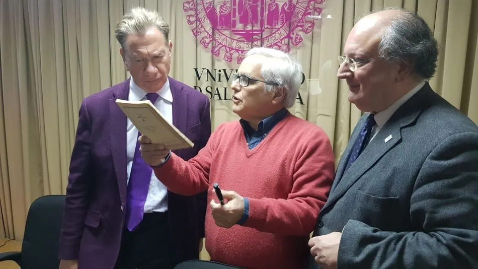 Antes de comenzar el diálogo, Michael Portillo ha entregado a Enrique Cabero, vicerrector de Política Académica y Participación Social, un ejemplar original de la revista Horizon que contiene el relato sobre Unamuno para que se incorpore a los fondos de la Universidad de Salamanca.