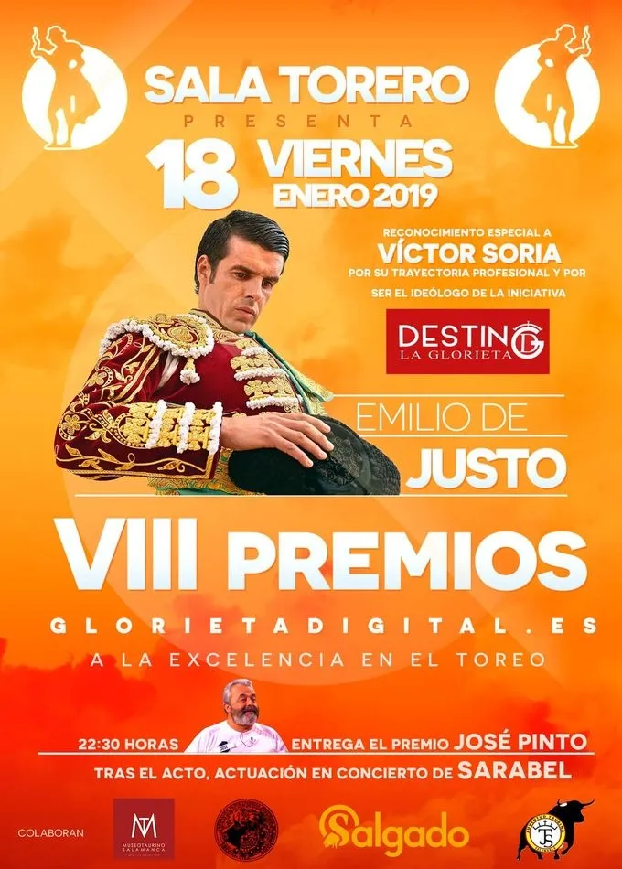 El matador de toros extremeño Emilio de Justo recogerá el próximo viernes, 18 de enero, en Salamanca el VIII trofeo a la ?Excelencia en el Toreo 2018?, patrocinado por ?Glorieta Digital? y Café Torero.