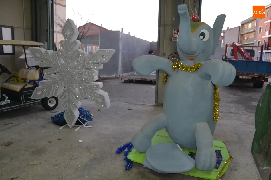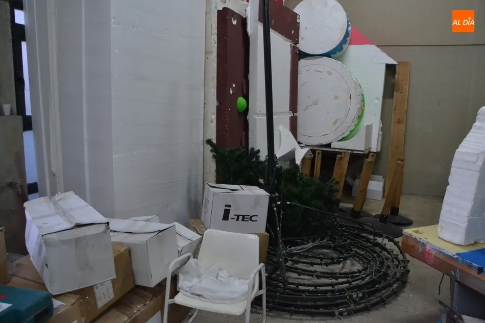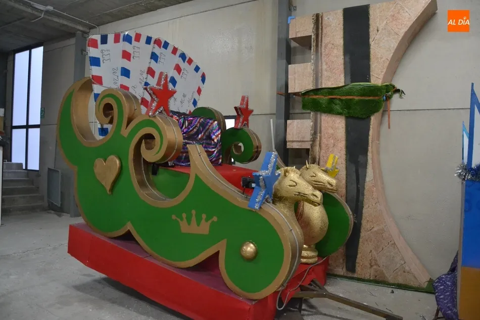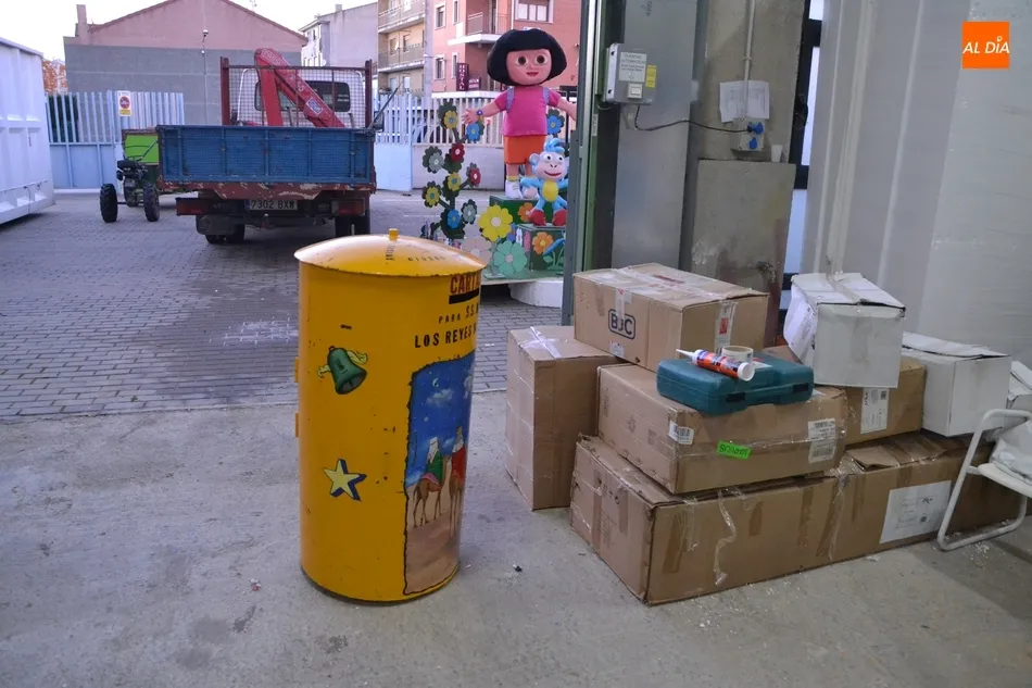 En ese lateral donde han sido guardadas las estructuras de las carrozas también han quedado almacenados otros elementos de los Amigos de la Ilusión, como la carroza del Cartero Real. Como remate, se colocó una especie de lona para dejar aislado ese lateral del resto de la nave, ya que durante el resto del año es usada por el Ayuntamiento de Ciudad Rodrigo para otros fines.