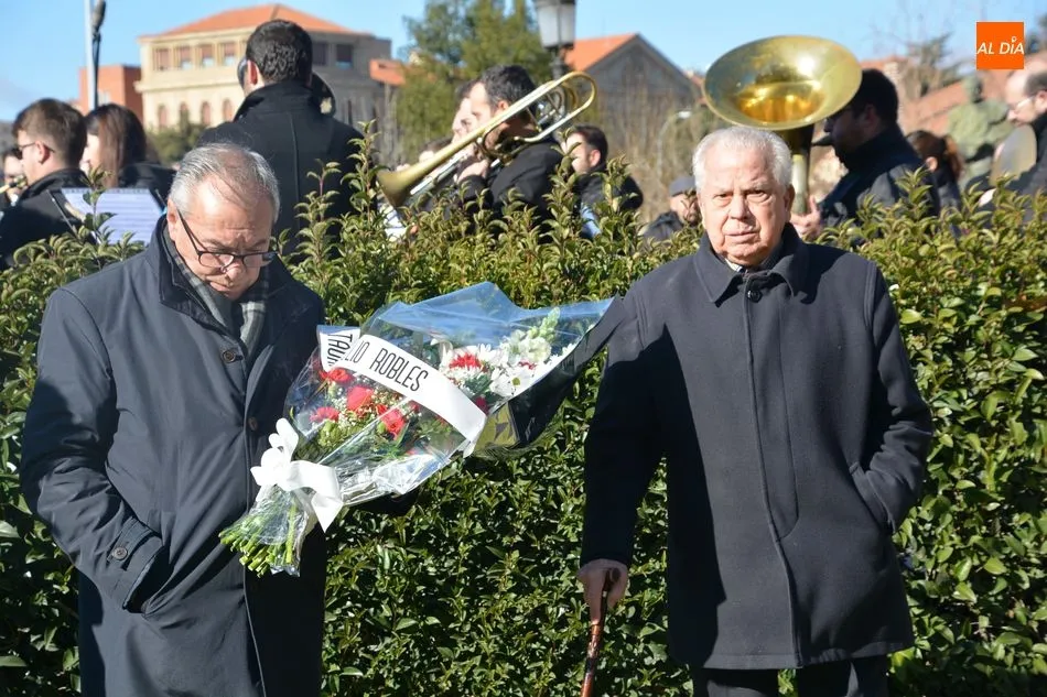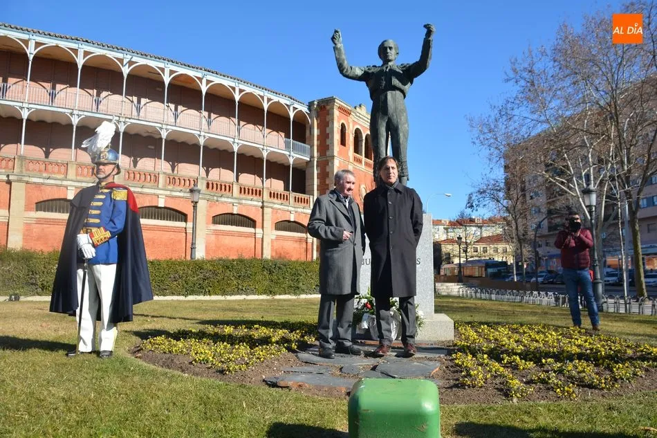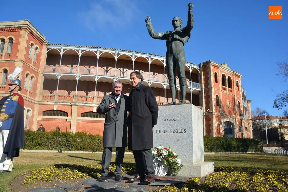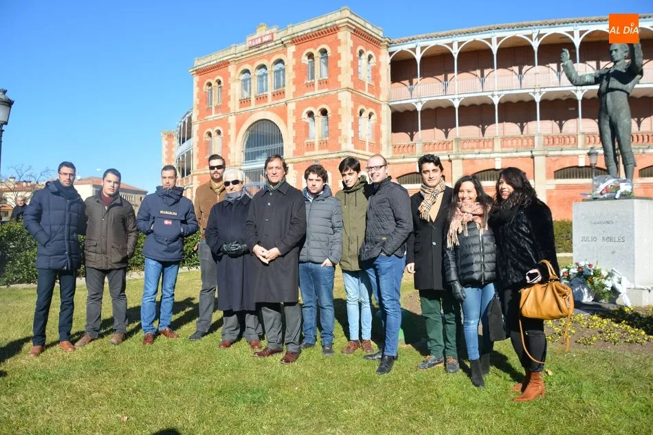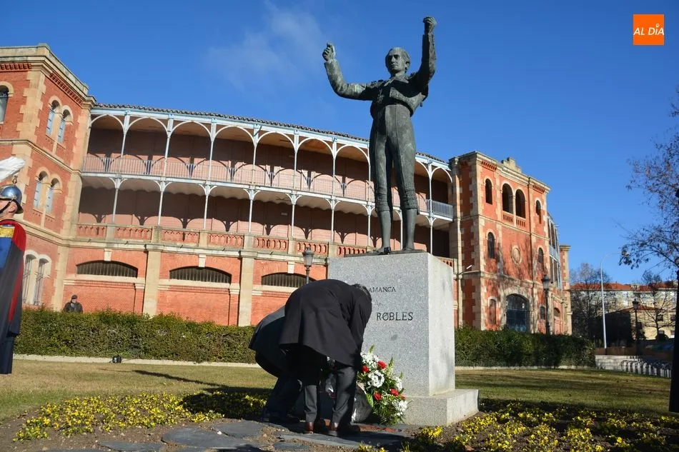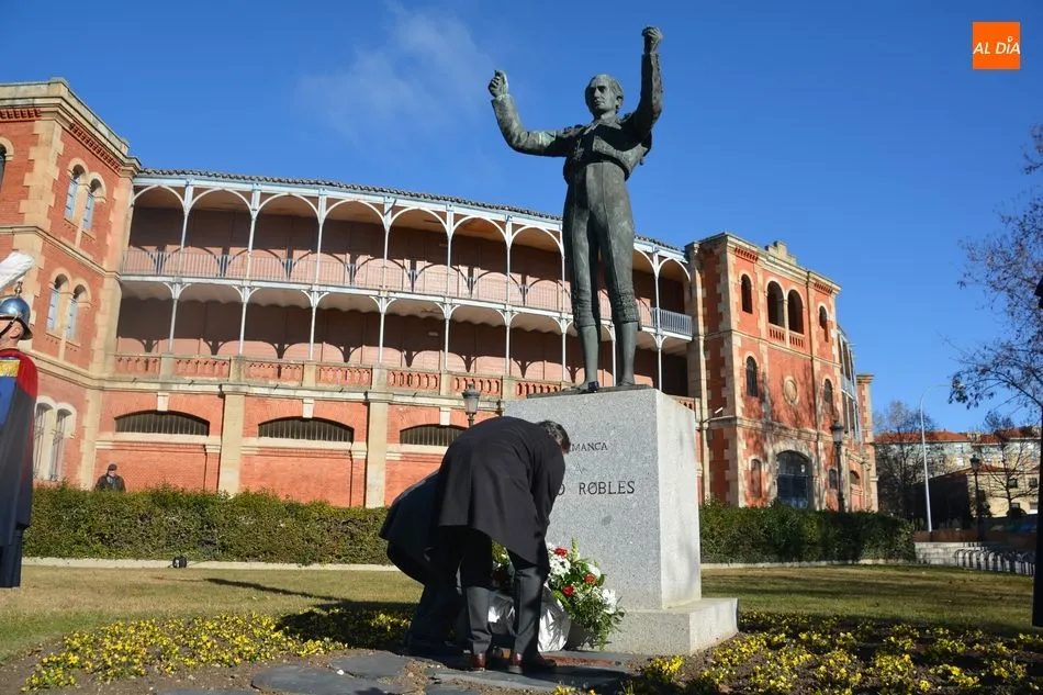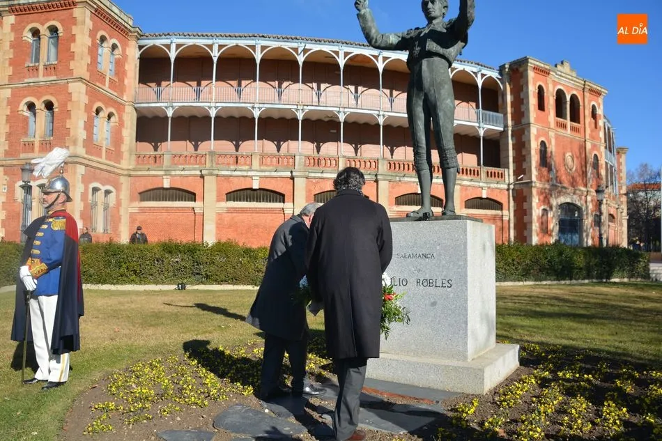 El Ayuntamiento y la Federación de Peñas Taurinas de Salamanca han rendido este sábado un sentido homenaje al matador de toros Julio Robles coincidiendo con el décimo octavo aniversario de su fallecimiento. El reconocimiento ha tenido lugar junto a la estatua que recuerda al diestro, obra del artista Salvador Amaya, y que está situada a las puertas de la plaza de toros de La Glorieta.