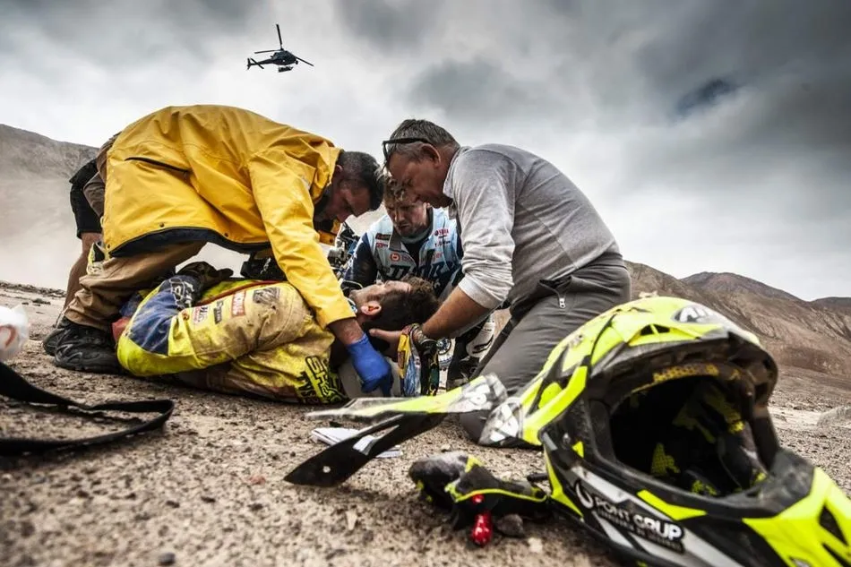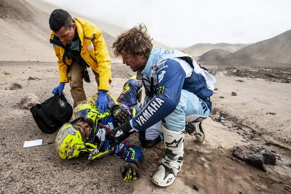 Lorenzo Santolino tuvo que retirarse este domingo, día 13 de enero, del Rally Dakar tras sufrir una tremenda caída en el inicio de la sexta etapa, cuando estaba siendo la revelación de la carrera. La caída se produjo, según la organización, en el kilómetro 33 de la especial de la sexta etapa, aunque se desconocen las circunstancias. El primero en auxiliarle ha sido el piloto francés Adrien Van Beveren (Yamaha); también le ha auxiliado Kevin Benavides (Honda). Santolino fue evacuado por los servicios médicos de la carrera al campamento, donde inicialmente se le diagnosticó fractura de cadera, además de diversos golpes y un traumatismo craneoencefálico. Después, fue trasladado a un hospital en Lima, a mil kilómetros de Arequipa, de donde partía la etapa.