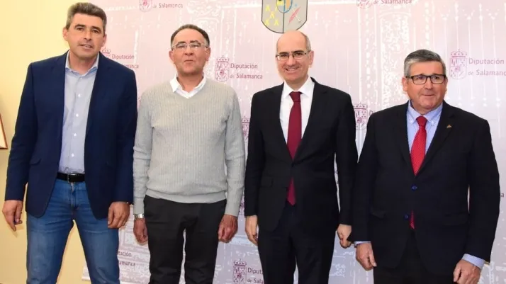 El presidente de la Diputación de Salamanca, Javier Iglesias y los miembros del patronato de la Fundación, Juan del Pozo y Juan José Peralta, han suscrito esta mañana en el Palacio de La Salina un convenio de colaboración en virtud del cual la institución provincial materializa su colaboración en el proyecto de trasladar la Escuela de Hostelería y Turismo a la Granja de la Vega.