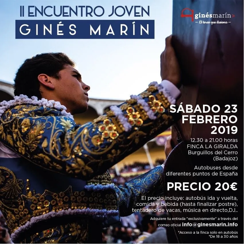 Además, el día 23 de febrero de 2019 tendrá lugar el II Encuentro Joven con Ginés Marín en la Finca La Giralda, situada en la localidad de Burguillos del Cerro (Badajoz). Saldrán autobuses de todas las ciudades de España y el precio es de veinte euros en los cuales está incluido el viaje en autobús (ida y vuelta), comida y bebida, tentadero de vacas, música en directo con dj y muchas más sorpresas a cargo del torero Ginés Marín. Las reservas se pueden realizar en el correo info@ginesmarin.info.