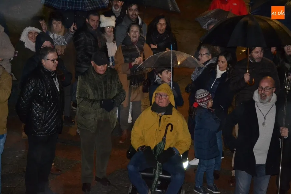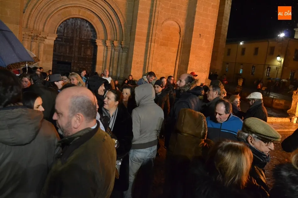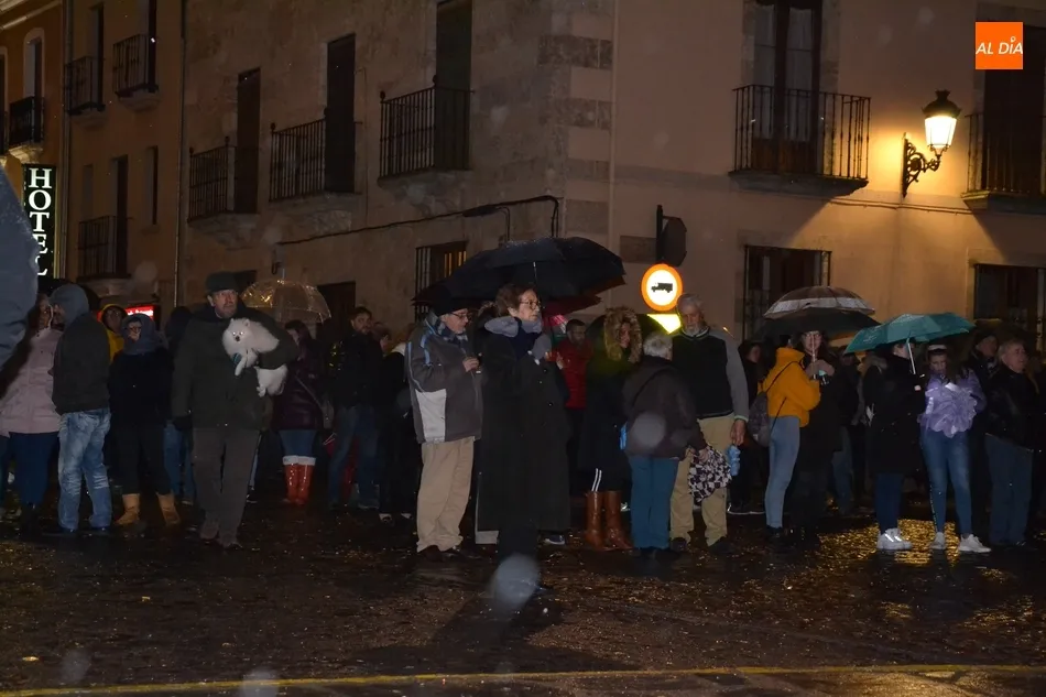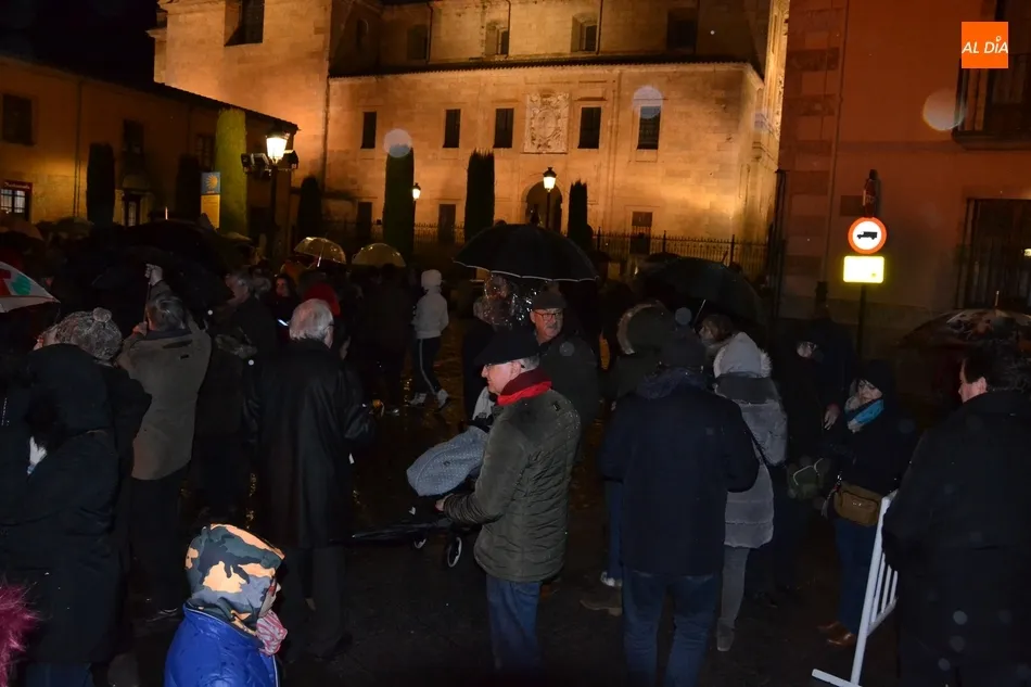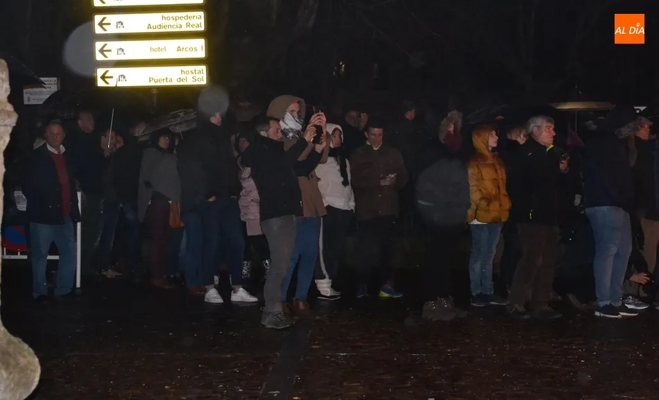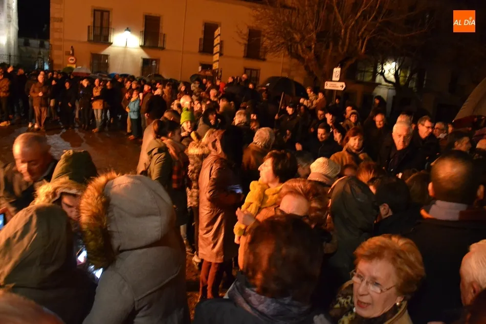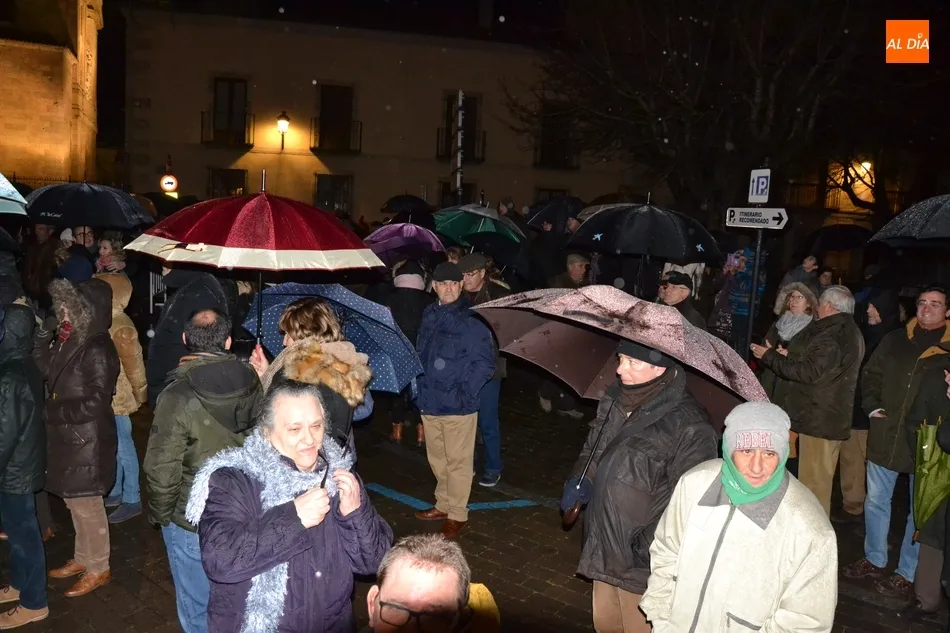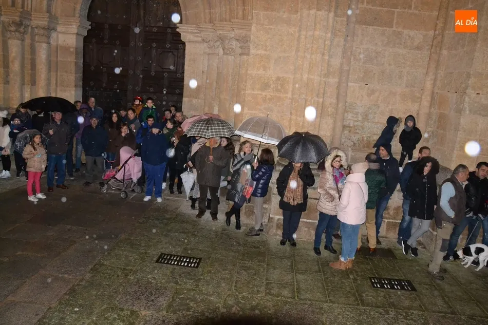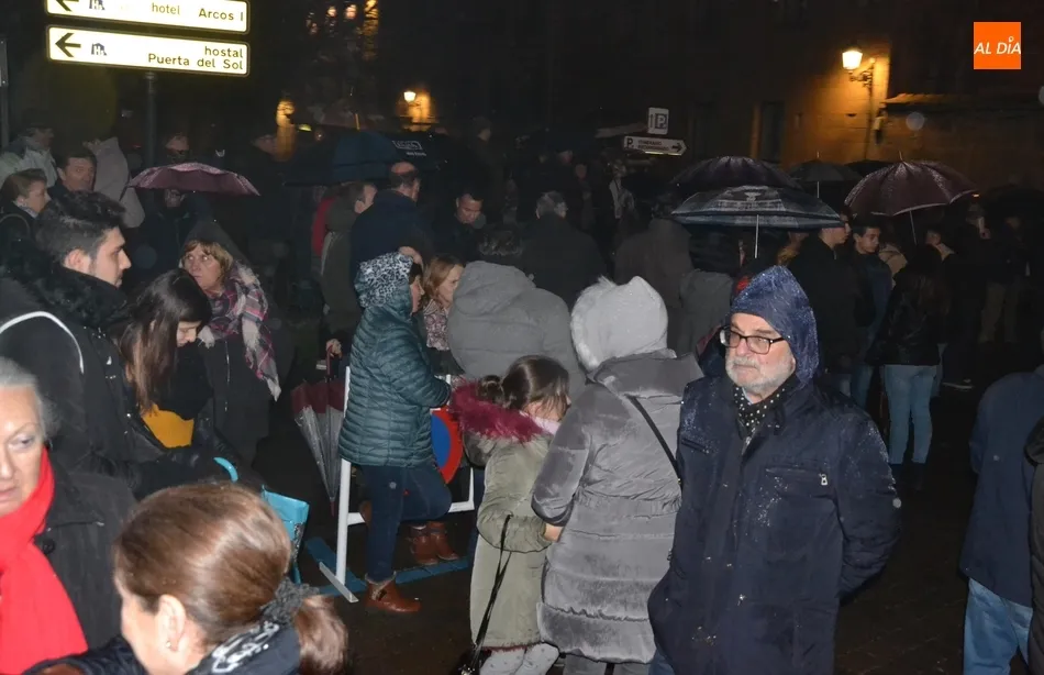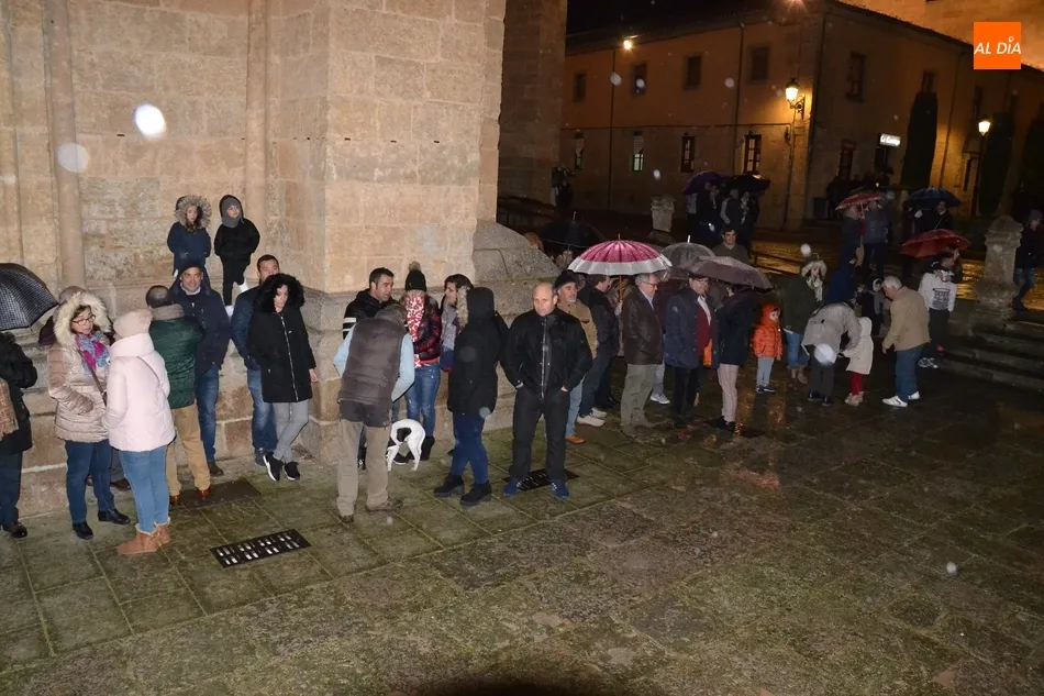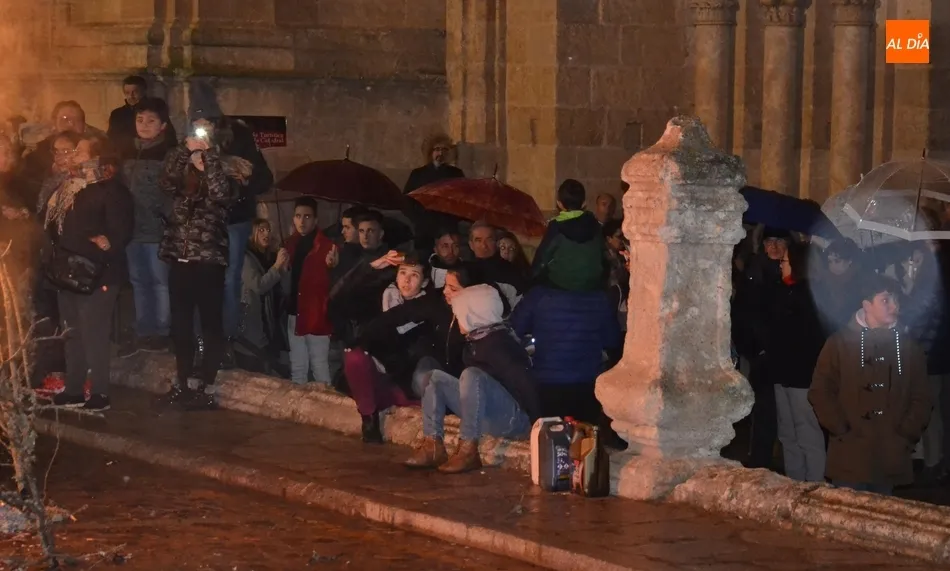 Como previamente no había llovido, hacía una buena temperatura, y además era sábado, varios cientos de mirobrigenses se fueron congregando -la mayoría paraguas en mano- en torno a la Catedral de Santa María, a la espera de que concluyera la última sesión de la novena en honor a San Sebastián, que comenzó el viernes de la semana pasada. Sobre las 20.15 horas concluyó la celebración en el interior, empezando los actos en la calle.