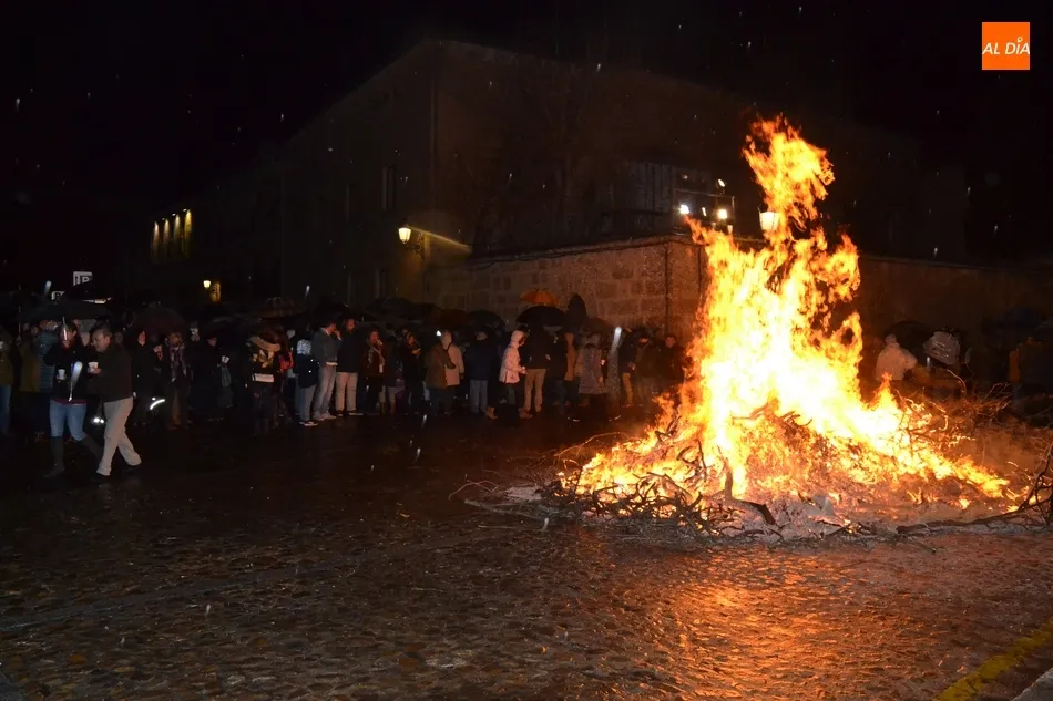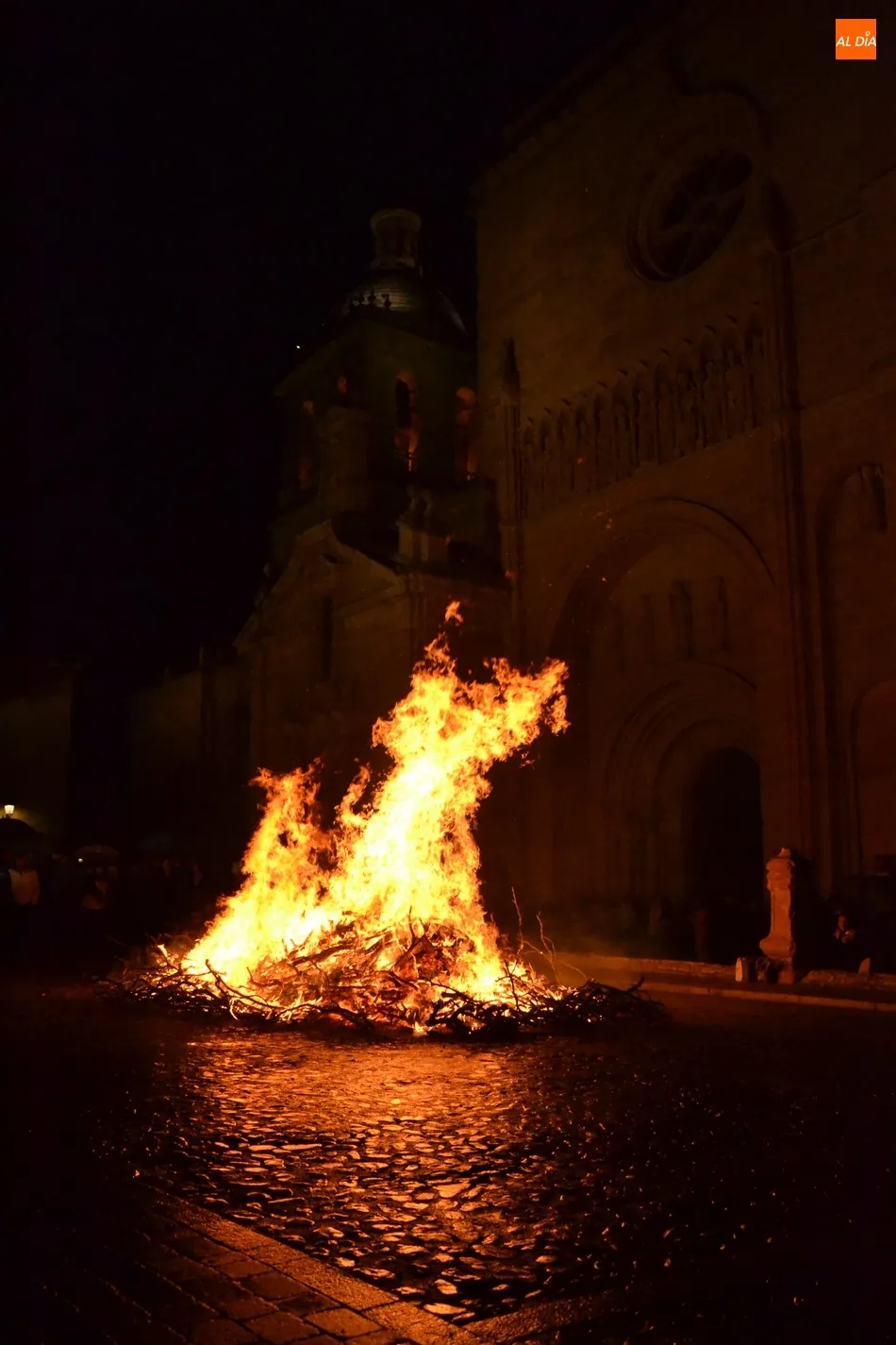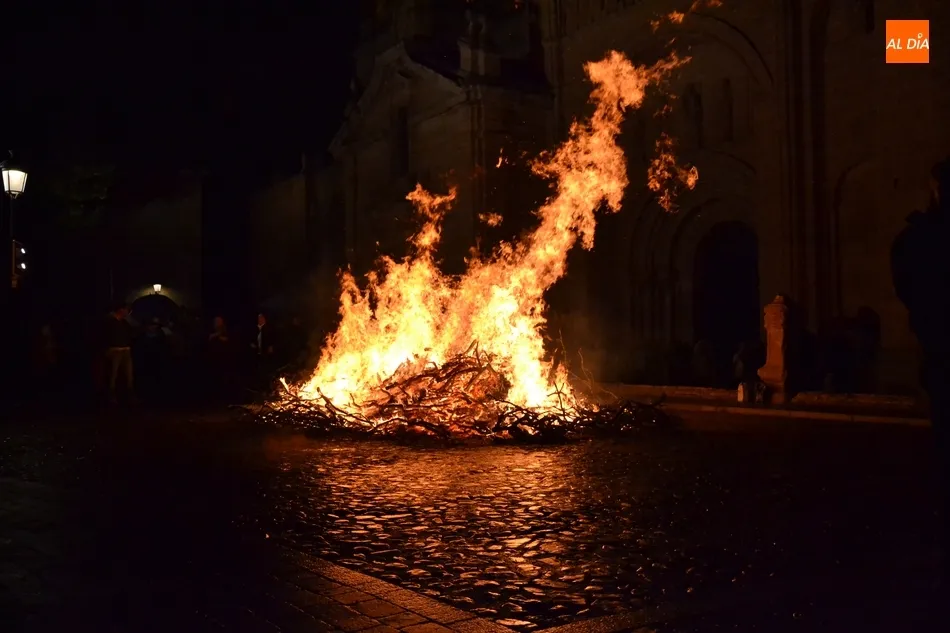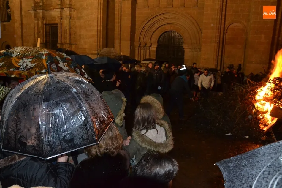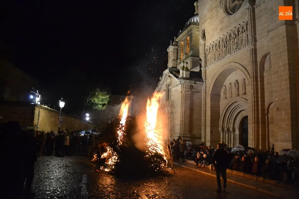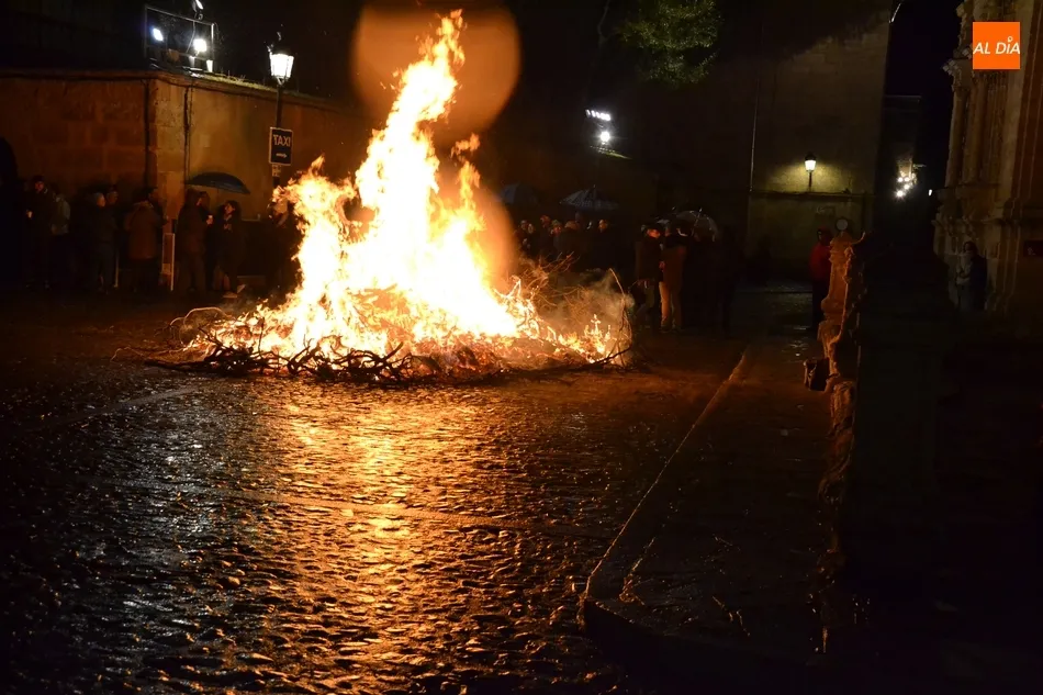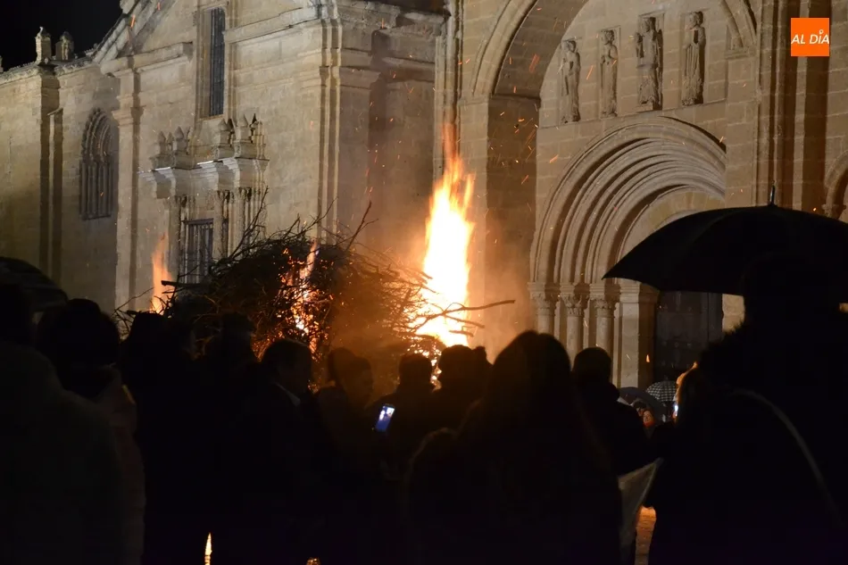 En el transcurso de la Ofrenda, comenzó a chispear, regresándose con más prisa de la habitual hasta las puertas de la Catedral, donde desde primera hora de la mañana estaba apilada la leña lista para arder. Una vez los responsables de la Cofradía estuvieron allí, se procedió a su prendido. Aunque costó un poco que arrancase, finalmente se generó una buena hoguera bastante agradecida.