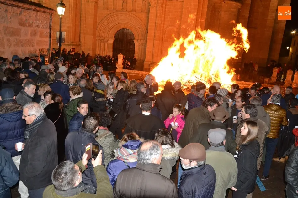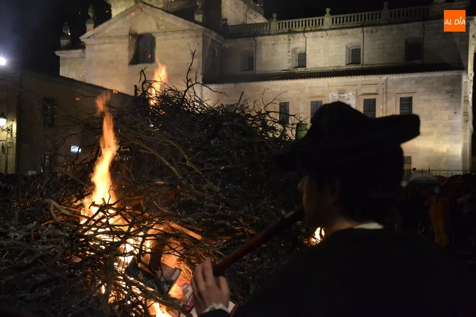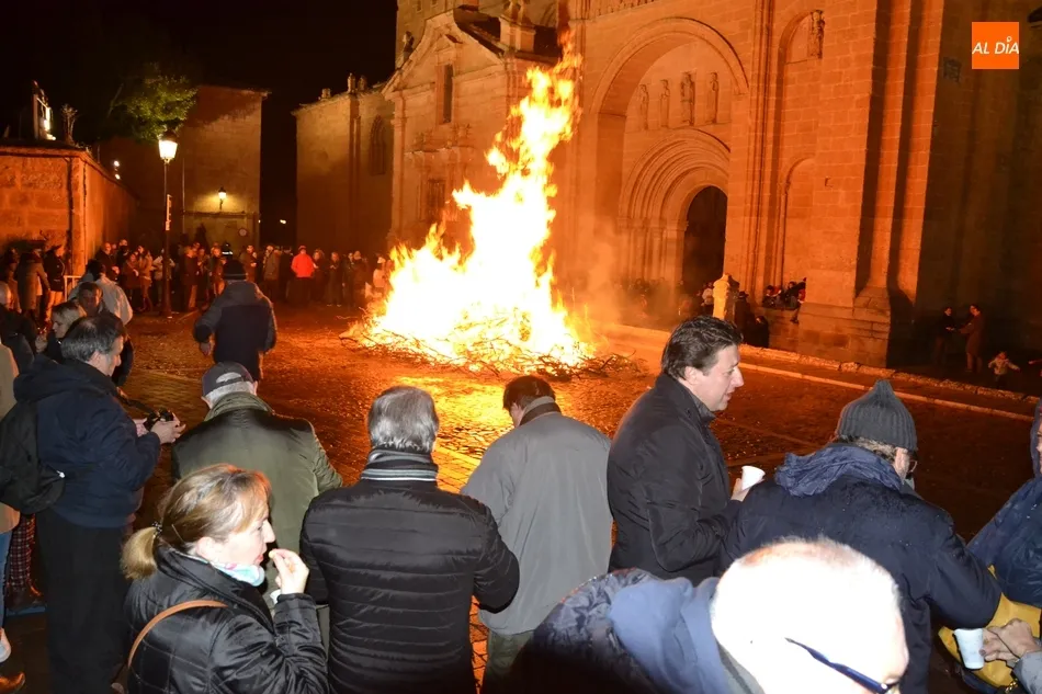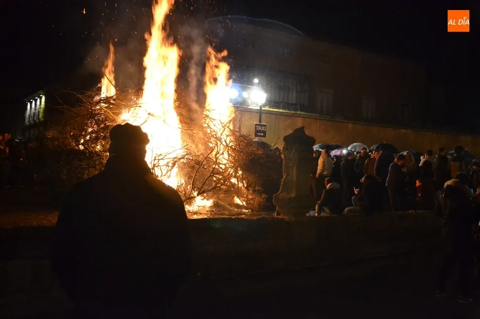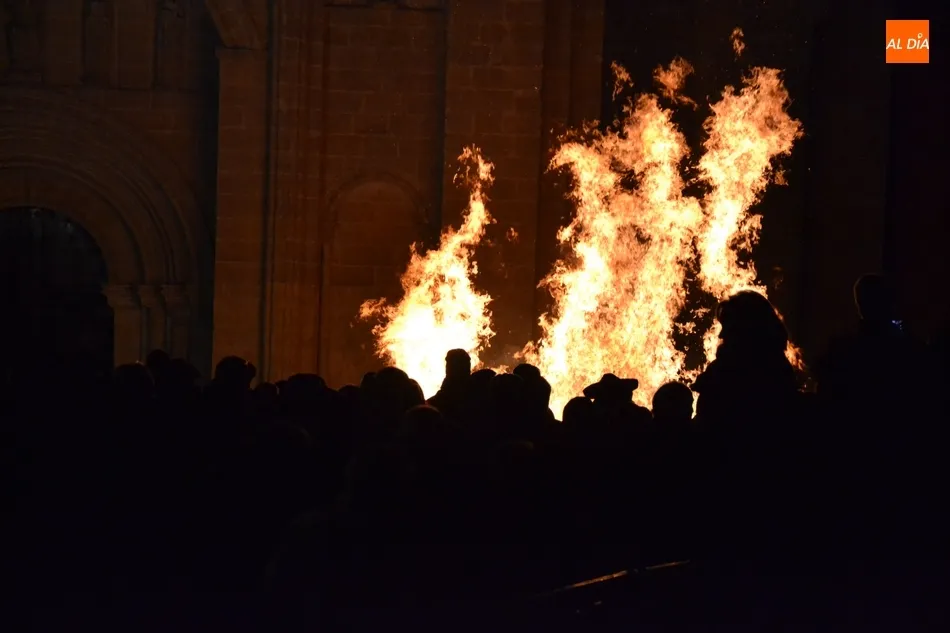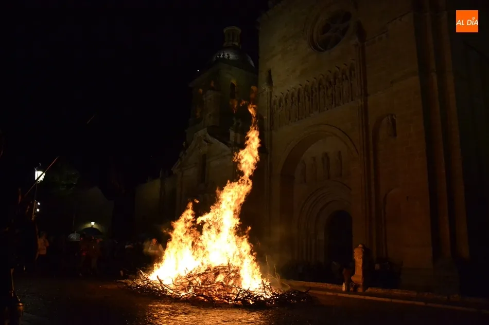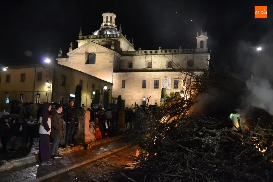 En el transcurso de la Ofrenda, comenzó a chispear, regresándose con más prisa de la habitual hasta las puertas de la Catedral, donde desde primera hora de la mañana estaba apilada la leña lista para arder. Una vez los responsables de la Cofradía estuvieron allí, se procedió a su prendido. Aunque costó un poco que arrancase, finalmente se generó una buena hoguera bastante agradecida.