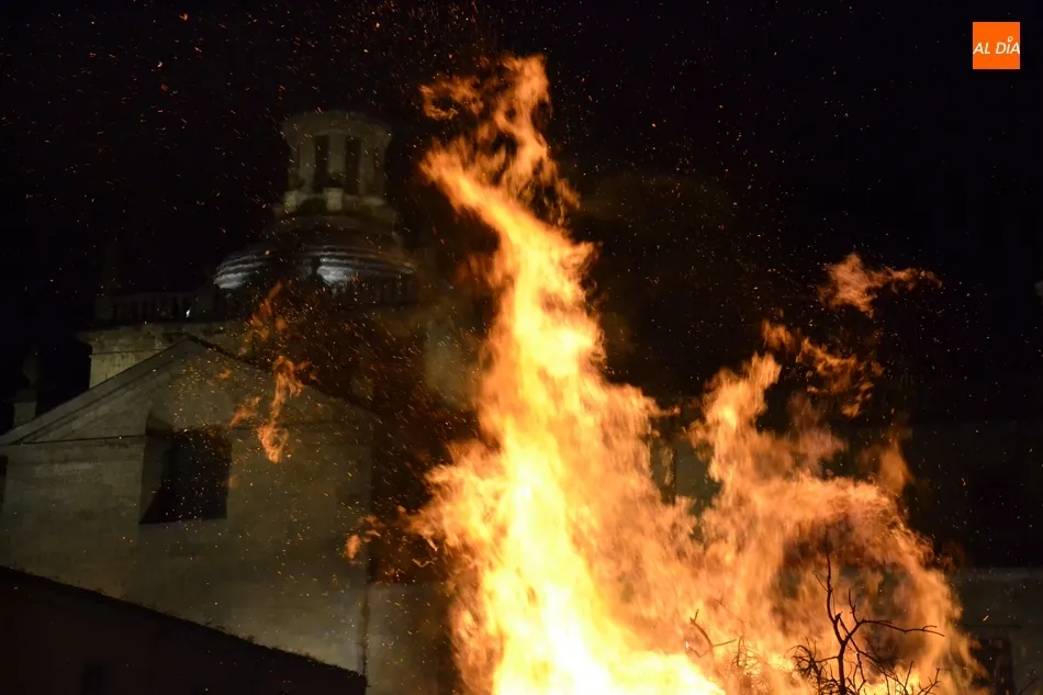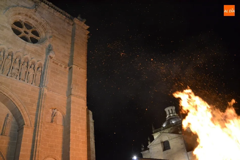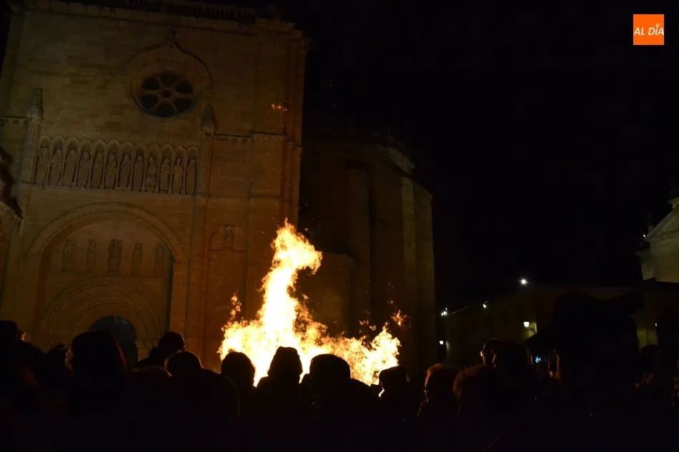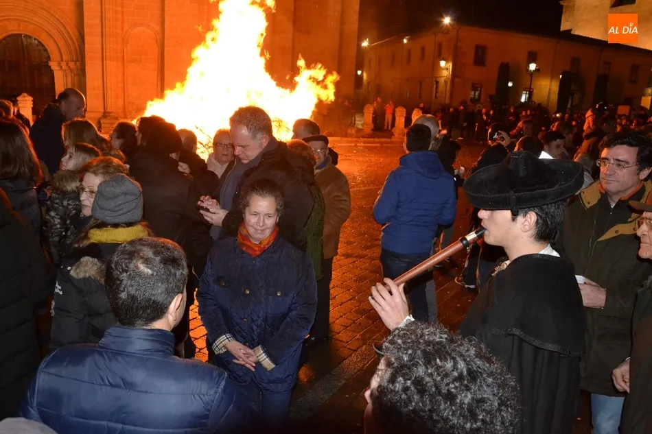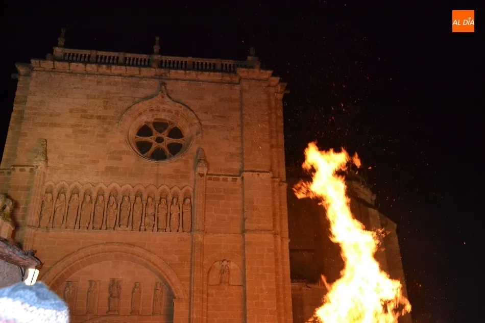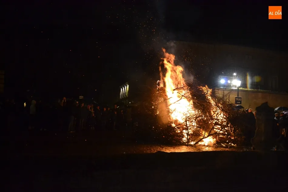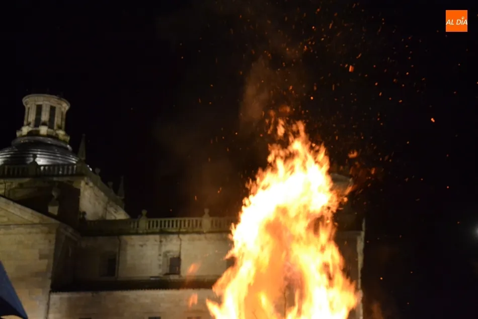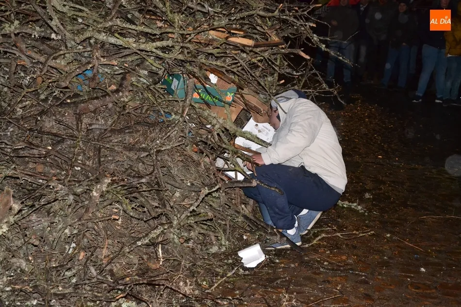 En el transcurso de la Ofrenda, comenzó a chispear, regresándose con más prisa de la habitual hasta las puertas de la Catedral, donde desde primera hora de la mañana estaba apilada la leña lista para arder. Una vez los responsables de la Cofradía estuvieron allí, se procedió a su prendido. Aunque costó un poco que arrancase, finalmente se generó una buena hoguera bastante agradecida.