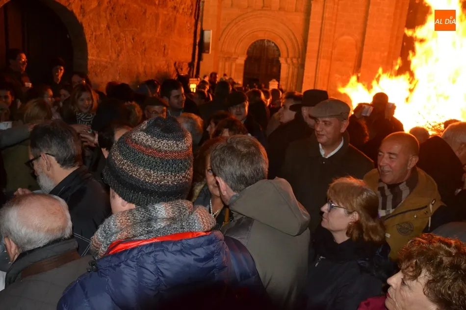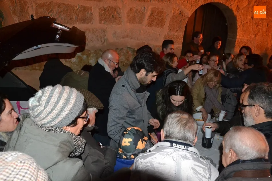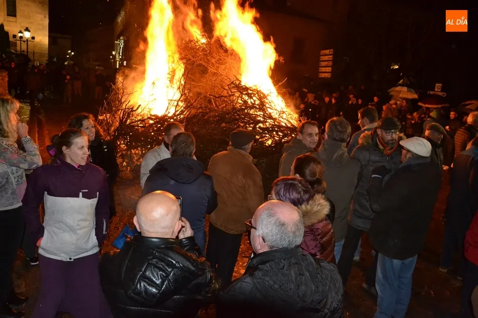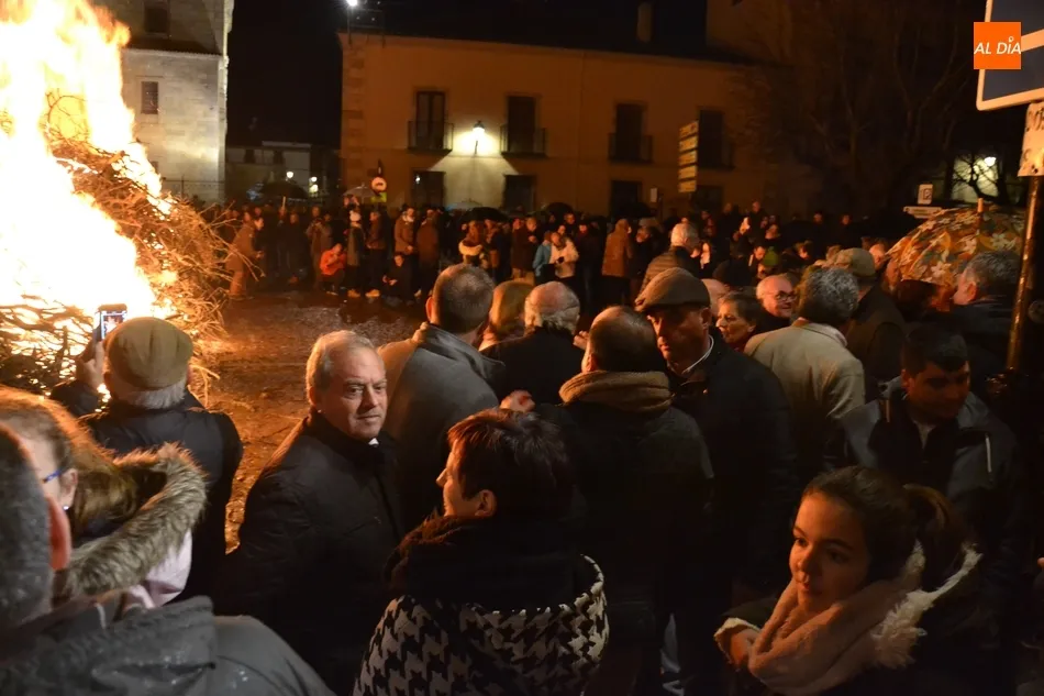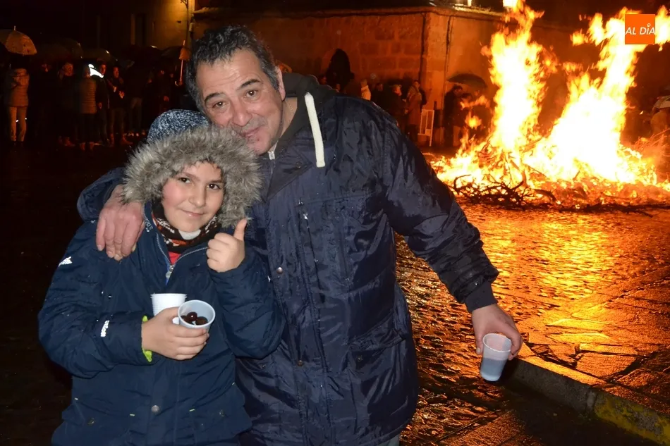 Con el fuego en marcha, los mayordomos empezaron a repartir entre todos aquellos que quisieron vino, chochos y aceitunas. En el transcurso de la hoguera, hubo otro momento dado en que chispeó varios segundos, mientras que cuando ya estaba muy avanzada, empezó a llover con más intensidad, lo que sí provocó una desbandada del lugar. La hoguera también fue animada por el tamborilero Juan Antonio Muñoz.