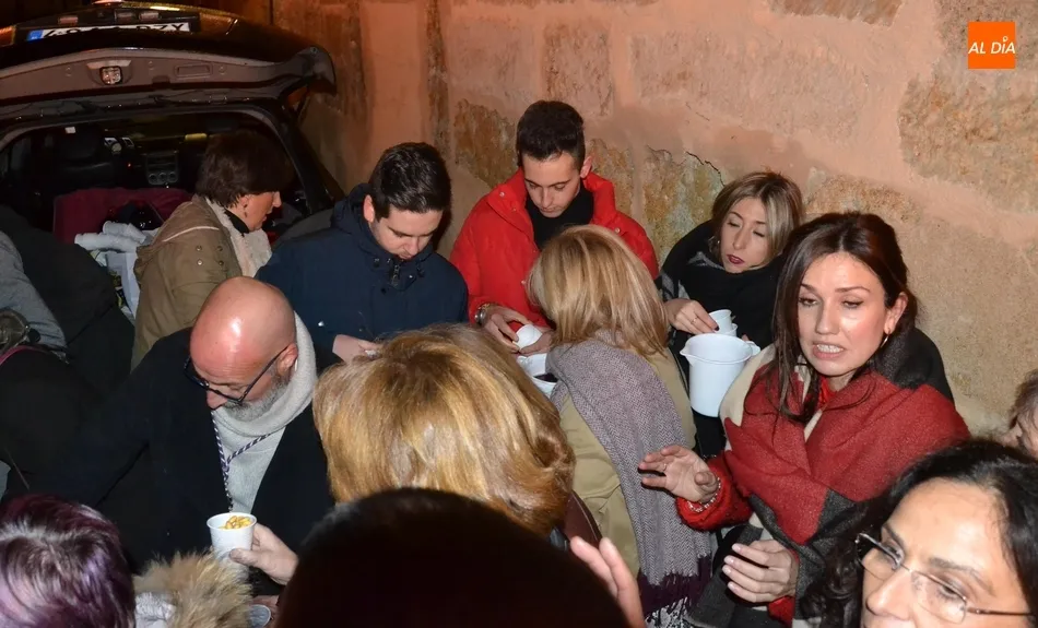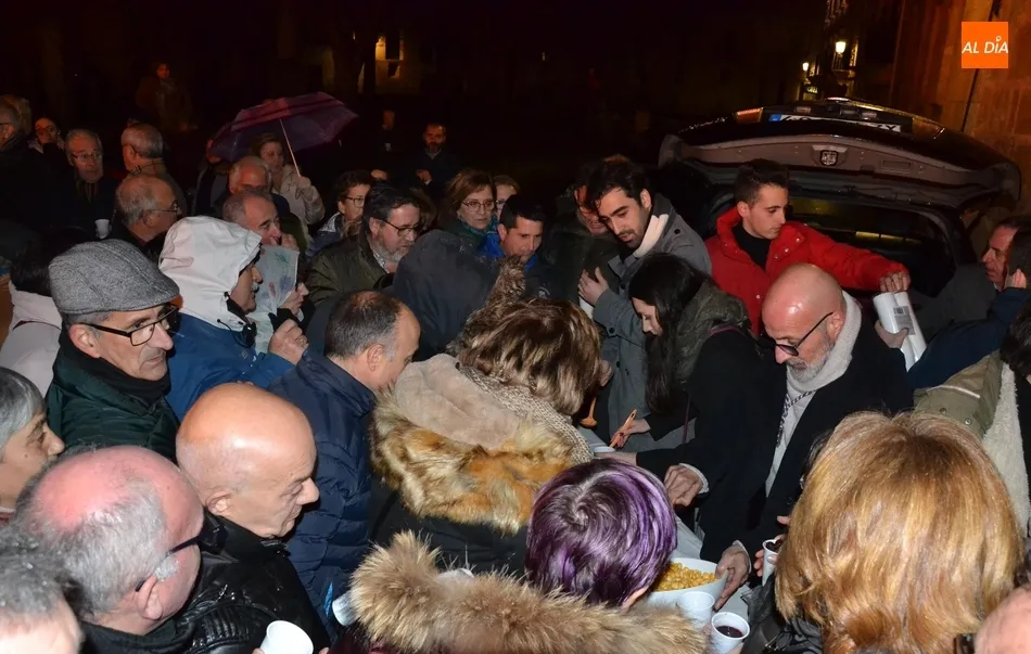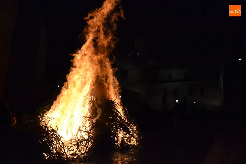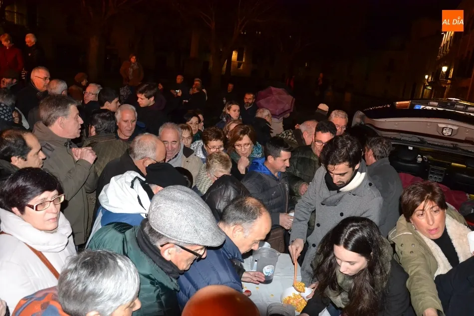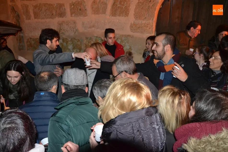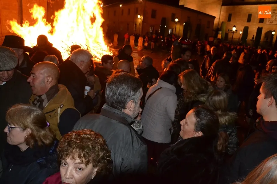 Con el fuego en marcha, los mayordomos empezaron a repartir entre todos aquellos que quisieron vino, chochos y aceitunas. En el transcurso de la hoguera, hubo otro momento dado en que chispeó varios segundos, mientras que cuando ya estaba muy avanzada, empezó a llover con más intensidad, lo que sí provocó una desbandada del lugar. La hoguera también fue animada por el tamborilero Juan Antonio Muñoz.