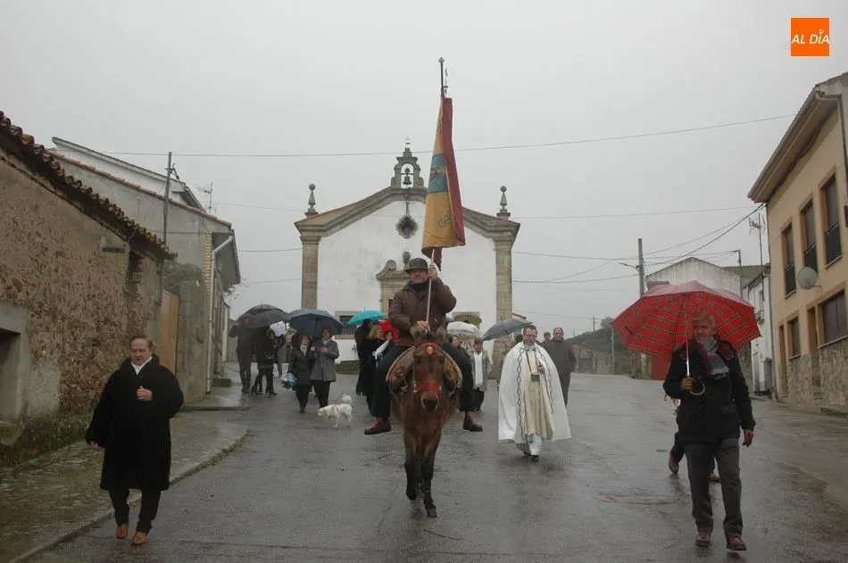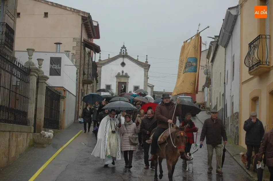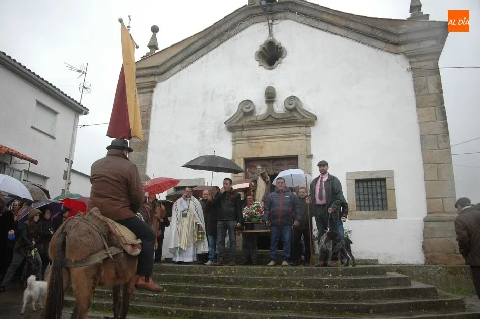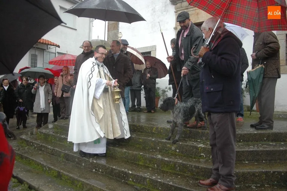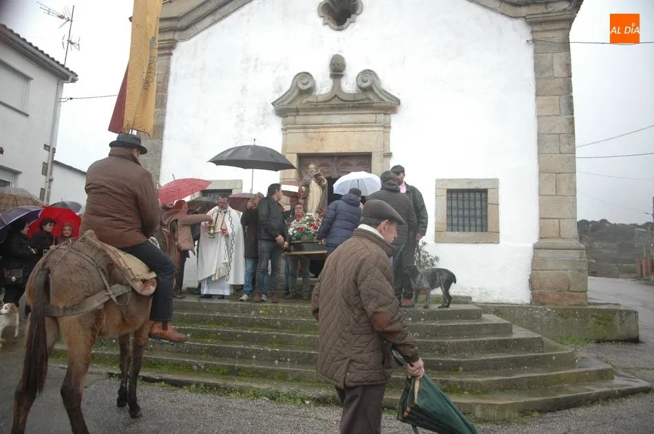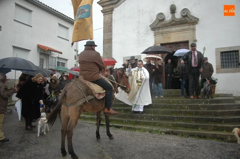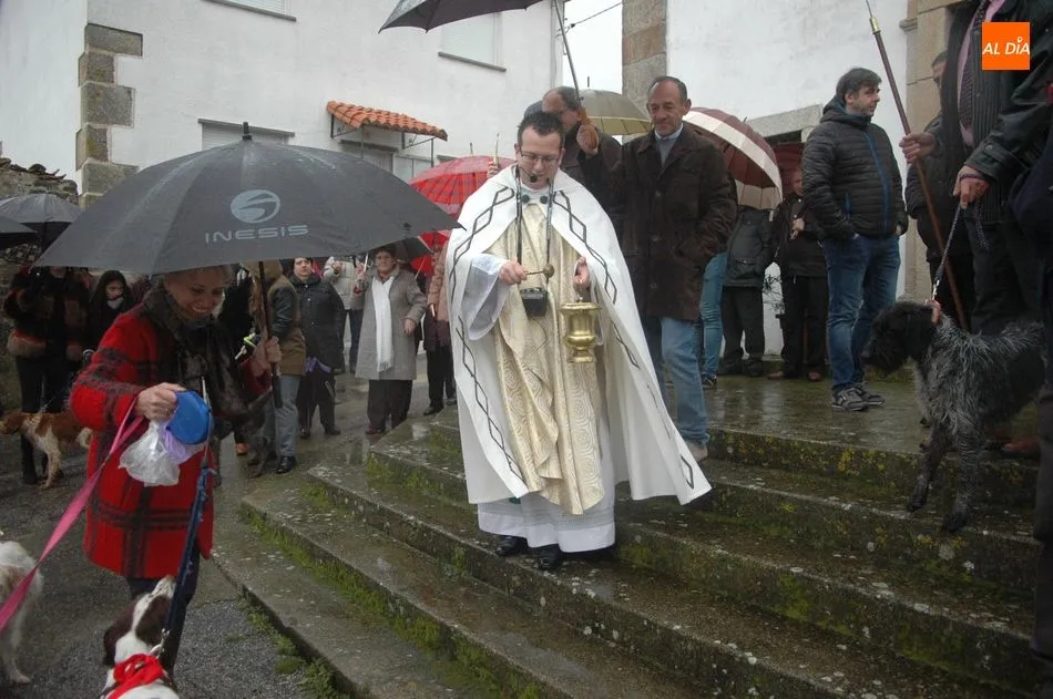 Tras la homilía, y a pesar de la lluvia, San Antón salía de la iglesia acompañado de los vecinos y el abanderado, enlomado sobre una caballería, en procesión camino hacia la ermita de San Lorenzo donde el sacerdote, Miguel Ángel García Miguel, procedió a la bendición de los animales, al que acudieron varios perros, mascota por excelencia en esta localidad, acompañando a sus dueños.