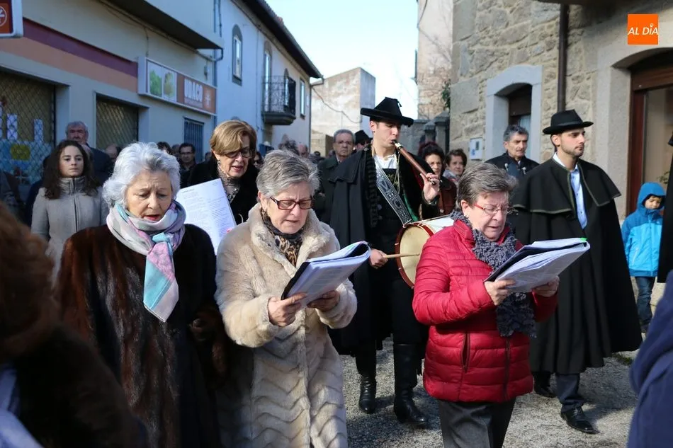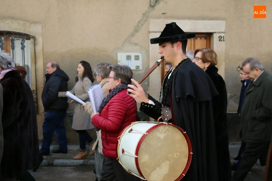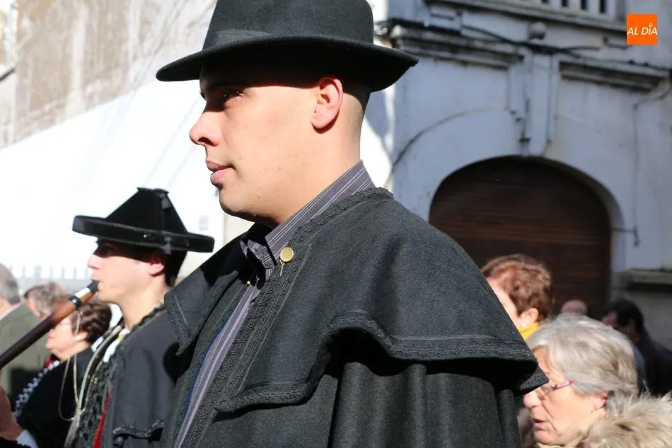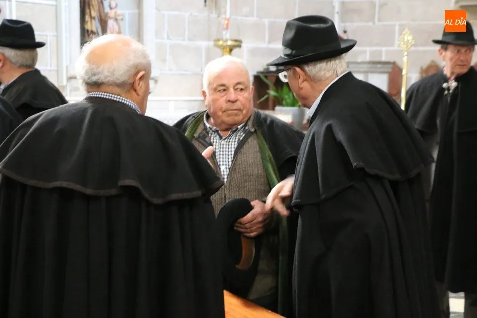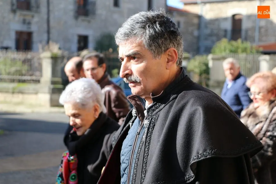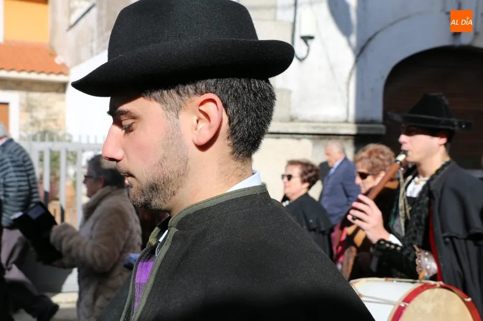 El acto comenzaba pasadas las 12.45 horas amenizado por sones de la gaita y el tamboril, solo interrumpido por momentos ante los cánticos de las mujeres que seguían a la comitiva de capas negras guiada por sus mayordomos.