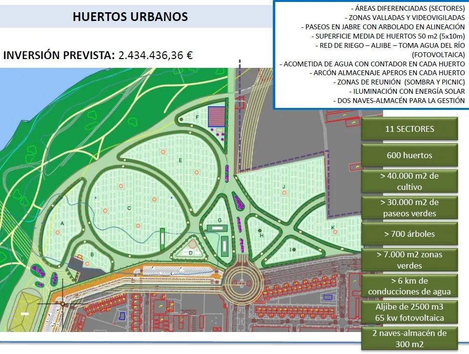 Para el riego de estos huertos urbanos ecológicos, se creará un aljibe de 2.500 metros cúbicos mantenido con planta fotovoltaica de bombeo, contadores de agua y alumbrado público eficiente. A estas infraestructuras se sumarán dos naves-almacén de 300 metros, con aseos públicos y una zona para el alquiler de aperos, además de zonas comunes con sombras y mesas para picnic, detalló el alcalde.