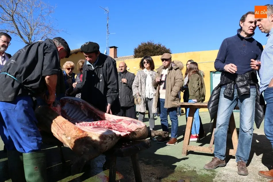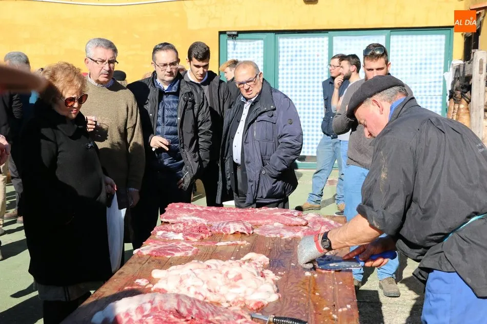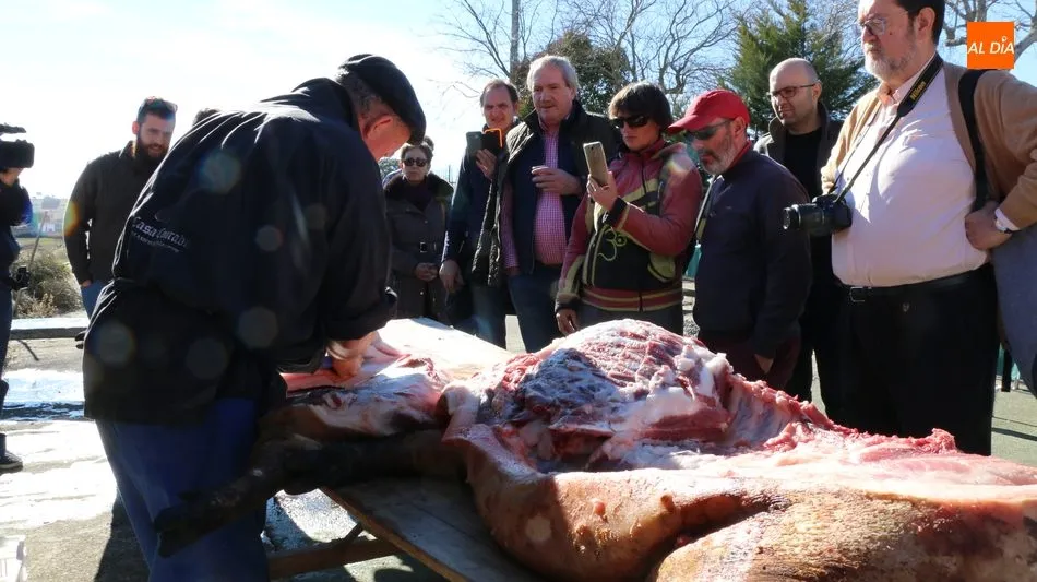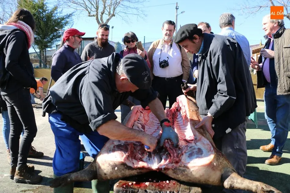 Tras el sacrificio del animal tenía lugar su chamuscado con ramos de piornos, momento que daría paso a la limpieza del tocino antes de su posterior despiece. Con las vísceras fuera, llegaba el momento de abrir la canal y extraer el espinazo, para proseguir con costillas, lomos, paletas y jamones. Una a una fueron apareciendo piezas hasta hace muy poco desconocidas para el gran público: la cruceta, la bola, el secreto o el lagarto, todas ellas muy apreciadas, proceso que el maestro chacinero iba narrando a un público muy interesado en conocer el despiece del gorrino.
