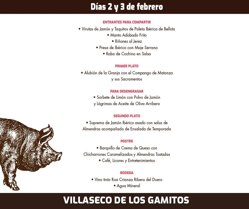 En la mesa, los comensales comenzarán con unos entrantes de virutas de paleta y taquitos de jamón ibérico de bellota, manto adobado frito, riñones al jerez, presa de ibérico con moje serrano y rabo de cochino en salsa. De primer plato, alubiones de La Granja con el compango de la matanza (oreja, panceta, chorizo?); y de segundo, suprema de jamón ibérico asado con salsa de almendras acompañado de ensalada de temporada. De postre, un barquillo de crema de queso con chicharrones caramelizados y almendras tostadas, además de café, perrunillas caseras y licores, y todo regado con tinto Roa Crianza, de la DO Ribera del Duero, y agua mineral.
