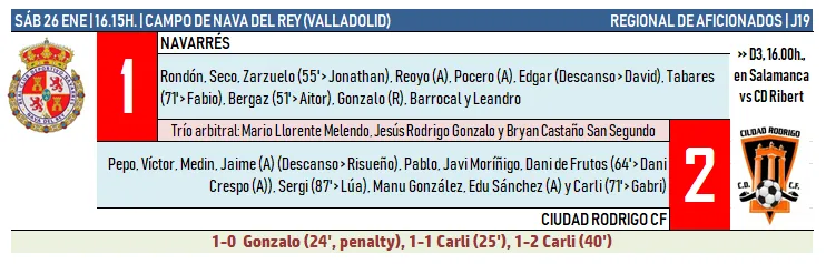 De este modo, Carli sumó en la tarde sabatina un doblete, que se une al que logró hace apenas dos semanas frente al Onzonilla en el Francisco Mateos, confirmando que ha empezado el 2019 a lo grande: tras no haber anotado en ninguno de los partidos que jugó antes de Navidad (sus primeros minutos fueron en la Jornada 11), en lo que va de año le ha puesto firma a 4 a de los 5 goles del Ciudad Rodrigo.