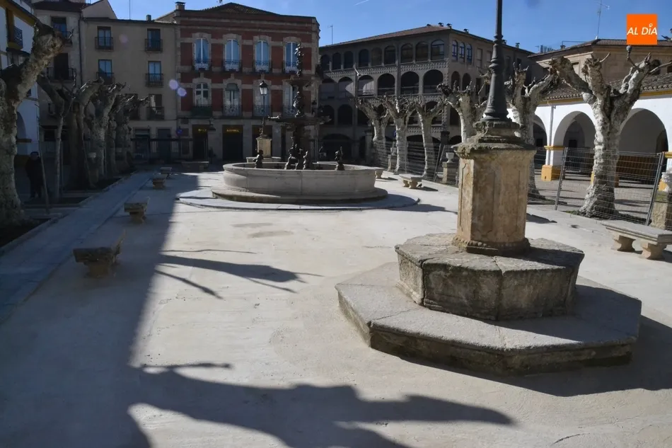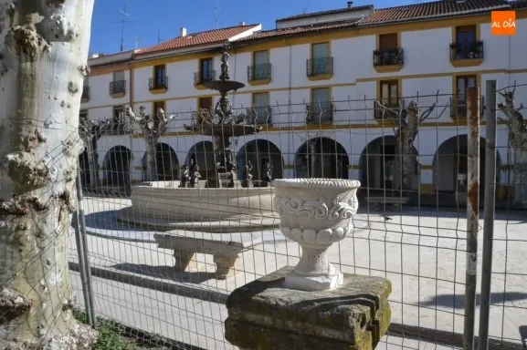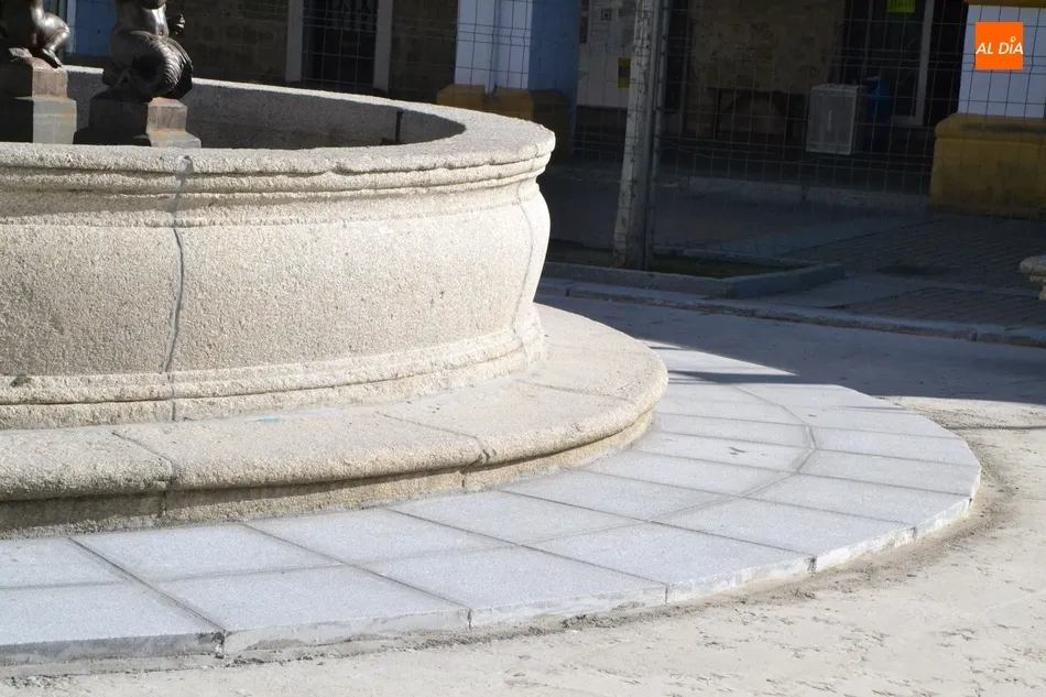 En lo que se refiere a la intervención para cambiar la superficie de la zona central, durante la semana pasada se estuvieron colocando unas losas en el contorno de la fuente, configurando un doble círculo. A partir de ahí, durante esta semana se irá desplegando el nuevo pavimento continuo de caucho de color de arena, que ya ha sido llevado hasta la Plazuela (se acumula en unos palés en los soportales).