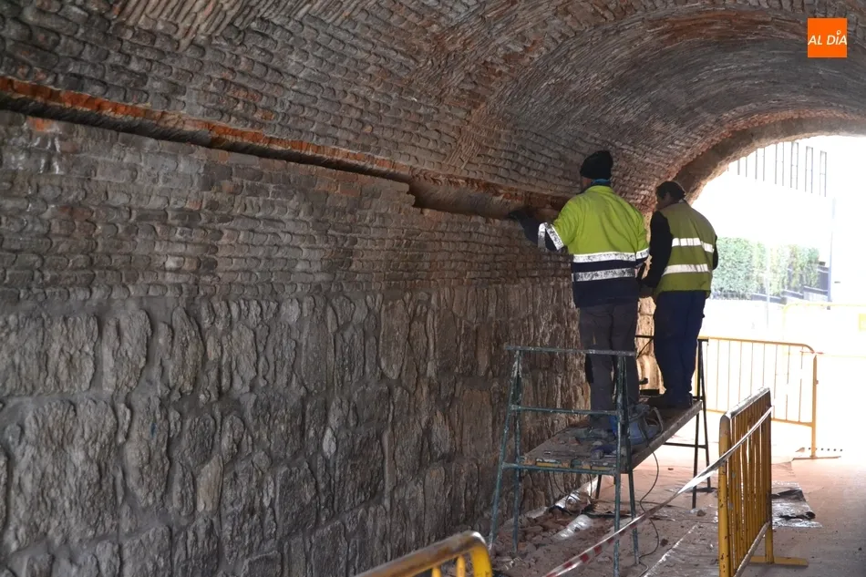 Según apunta Joaquín Pellicer a Ciudad Rodrigo Al Día, la intervención no se había podido realizar hasta ahora al no tener el ladrillo apropiado para colocar en esas hornacinas, por donde pasan varios cables. Para proteger el pavimento recién renovado, en la mañana del lunes se desplegaron por el suelo una serie de plásticos para que fuesen cayendo en ellos los trozos de ladrillo que se iban desprendiendo.