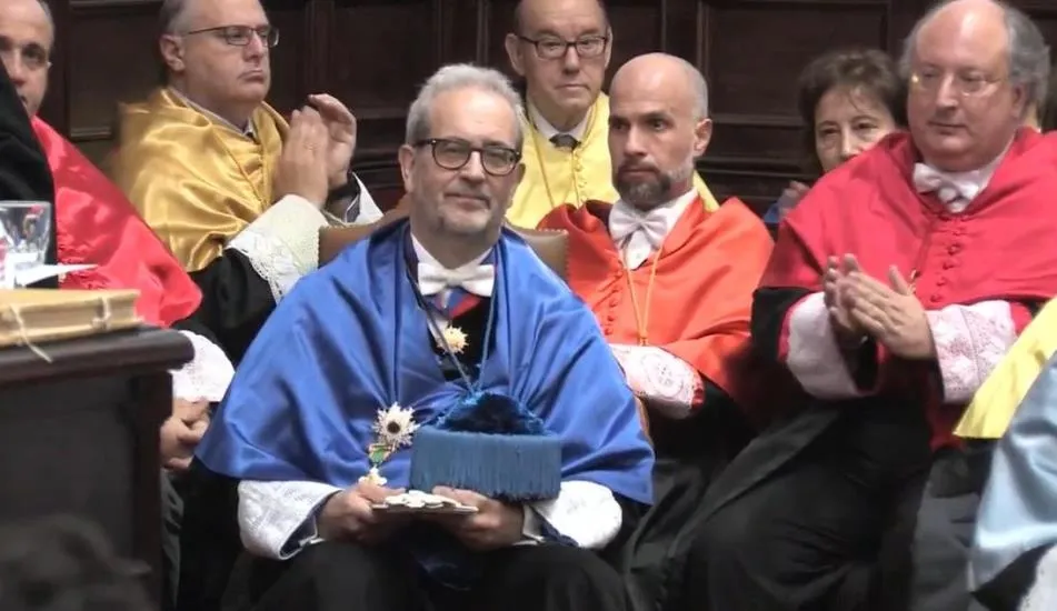 A continuación, tenía lugar la investidura de los nuevos doctores y doctoras, según el ceremonial tradicional, y llegaba el momento más emotivo con la imposición de la Medalla de la Universidad de Salamanca al exrector Daniel Hernández Ruipérez.