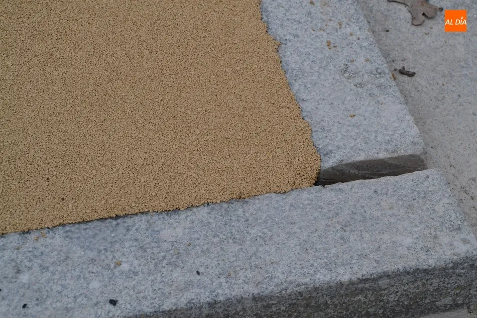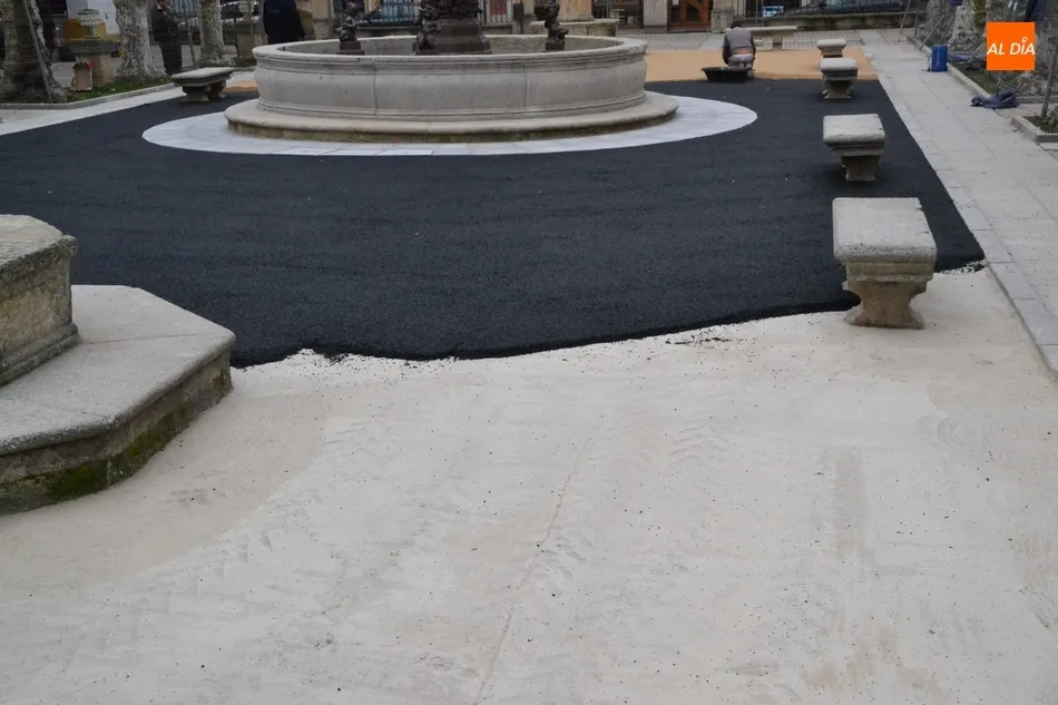 Durante esta última semana de enero, se está procediendo a dar el último paso, la extensión de la nueva superficie, consistente en un pavimento continuo de caucho del mismo color que la arena que había. Como se puede ver en las imágenes, ese proceso de expansión es totalmente manual, cubriendo poco a poco toda la zona, excepto el contorno más inmediato de la fuente, donde se han colocado losetas de granito.