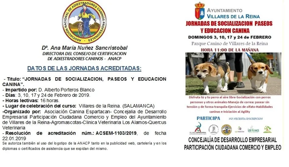 ?La importancia de tener un compañero, un perro apto y reconocido para la convivencia cívica, va tomando fuerza y desde mi Concejalia en el Ayuntamiento de Villares de la Reina vengo trabajando en este sentido de forma seria y constante con la ANACP y la Asociación Espartacan para lograr una educación y convivencia pacífica entre mascotas y vecinos?, asegura Antonio Malmierca, que añade que ?el paseo es una de las actividades del día más importantes que realizamos con nuestro perro y con estos jornadas enseñaremos cuál es el material más adecuado para pasear al perro, cómo pasear con tu perro sin que tire de la correa, cómo hacer presentaciones entre perros y entender la comunicación entre ellos para que puedan estar juntos, a la vez que disfrutamos del entorno de Villares de Reina?
