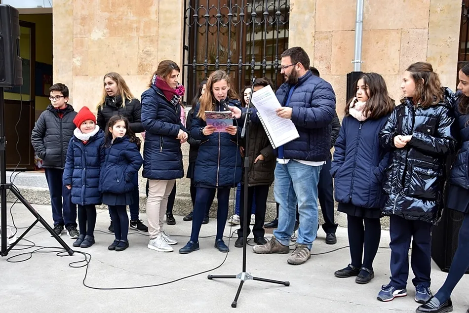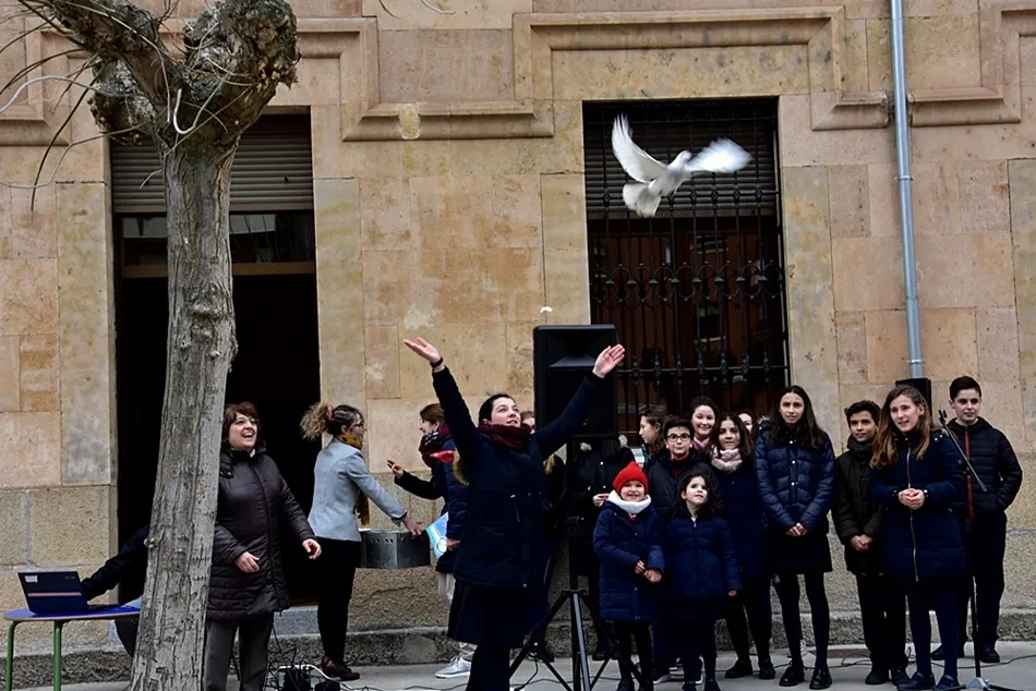 Los alumnos del colegio de Las Esclavas se mueven por un sueño común: la paz. Seguidamente dos representantes de cada etapa educativa han leído unas frases alusivas a la paz. Con la liberación de una paloma de la paz, la comunidad educativa ha manifestado su intención de celebrar la paz en nuestra ciudad y en todo el mundo todos los días.