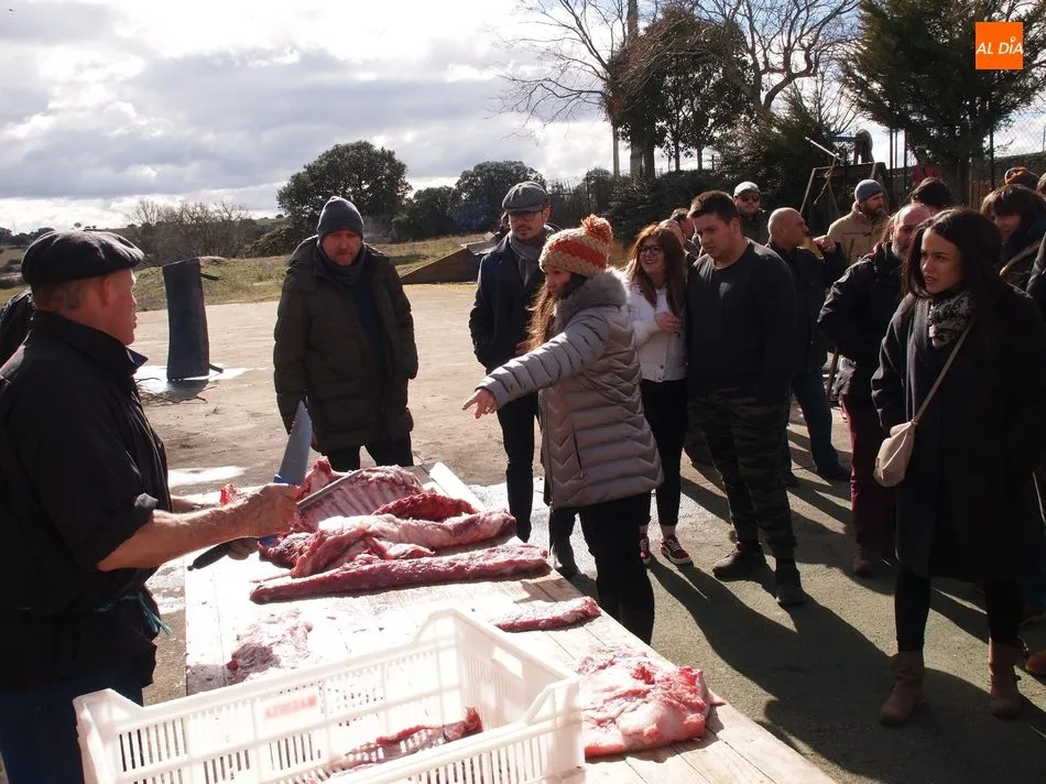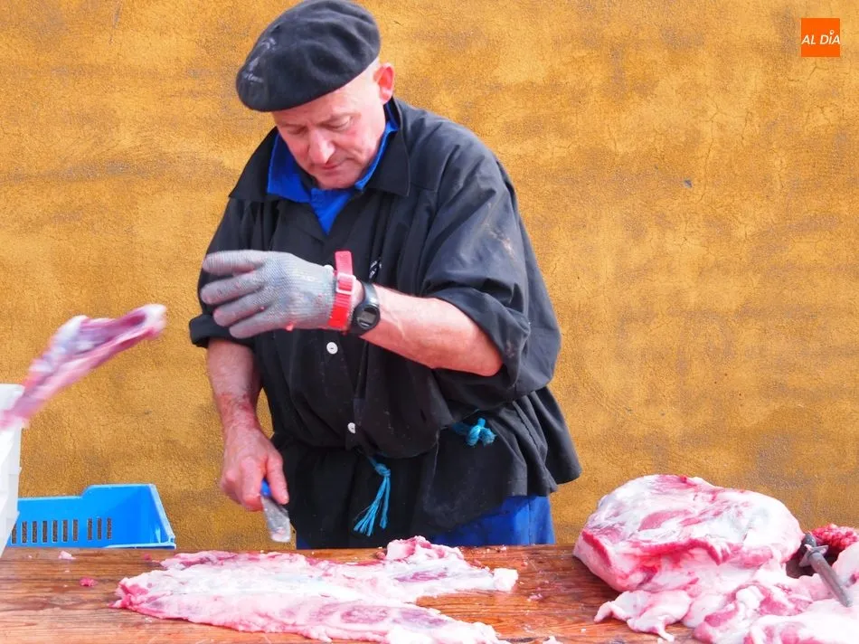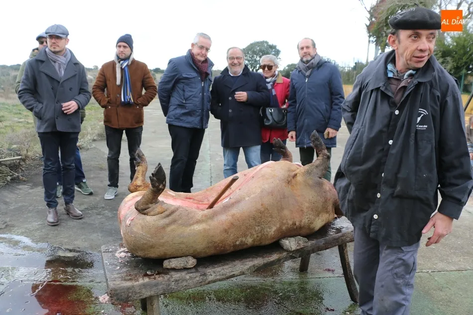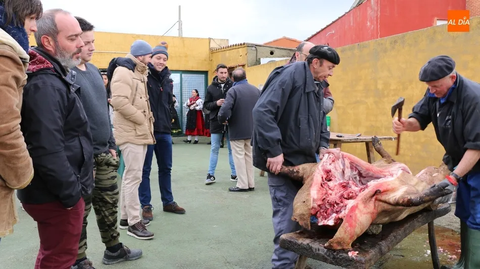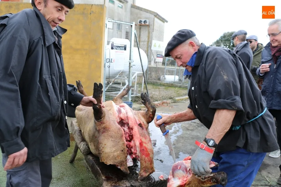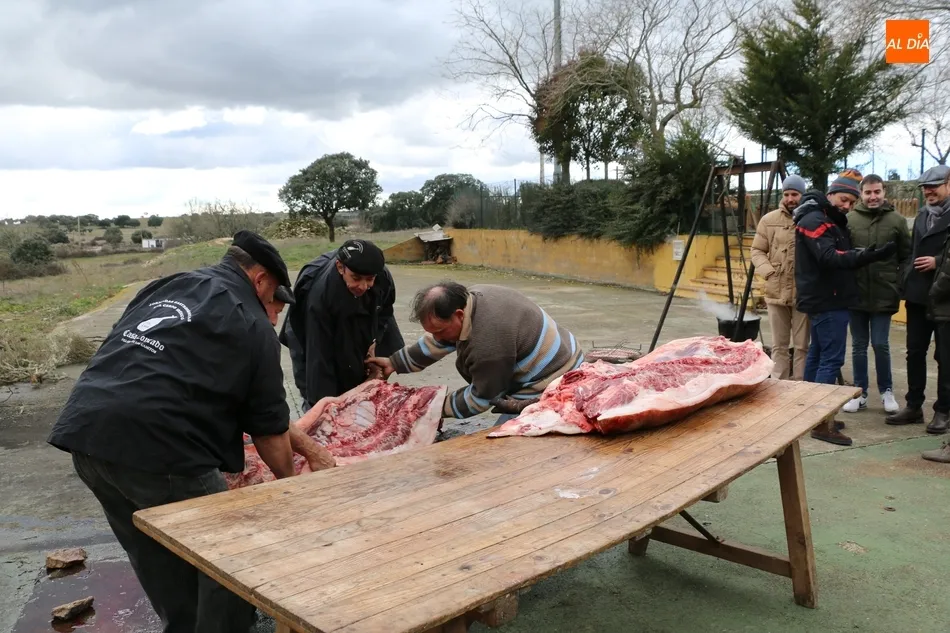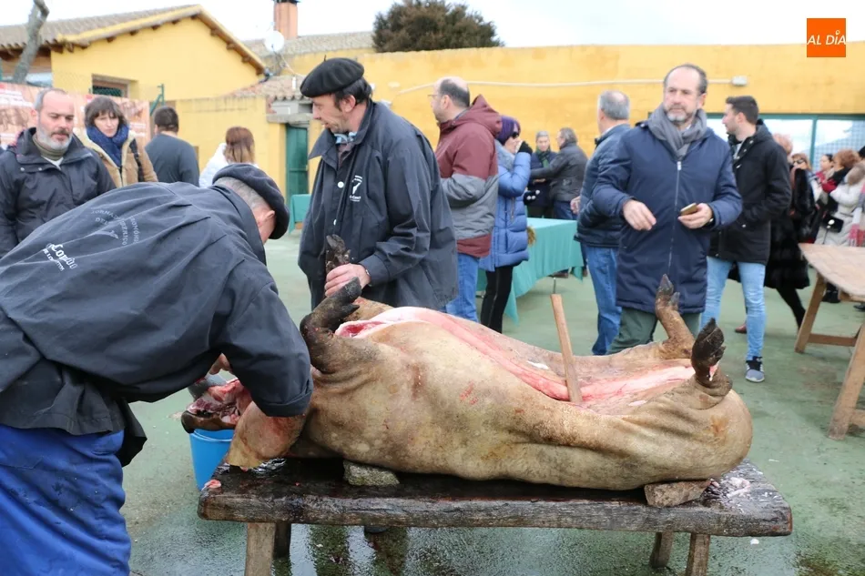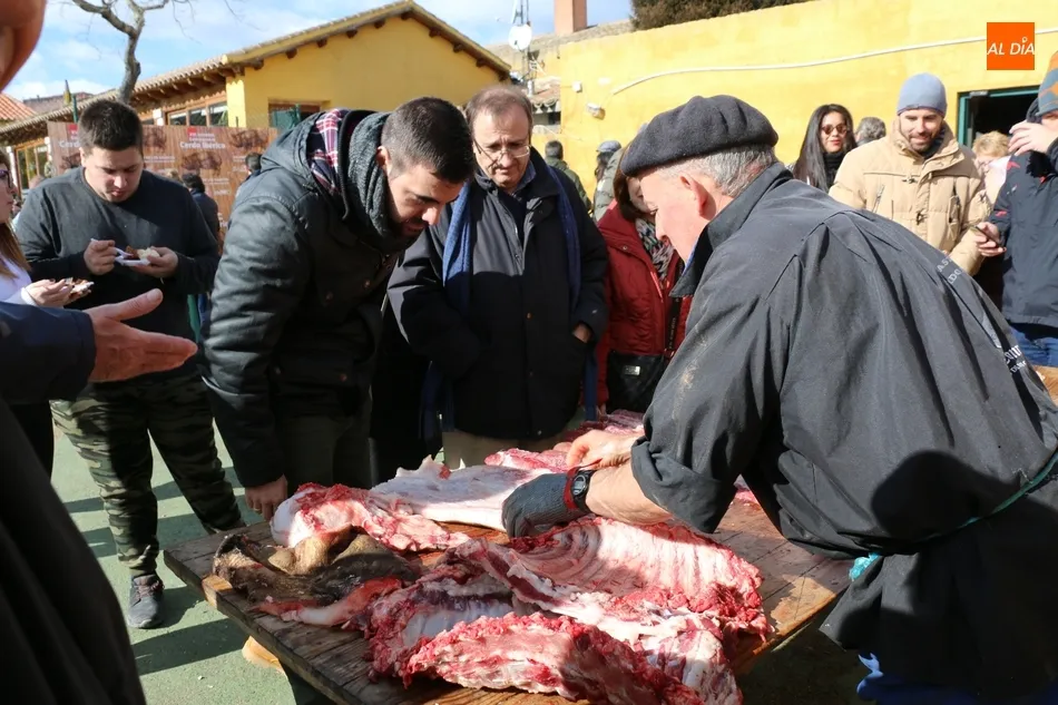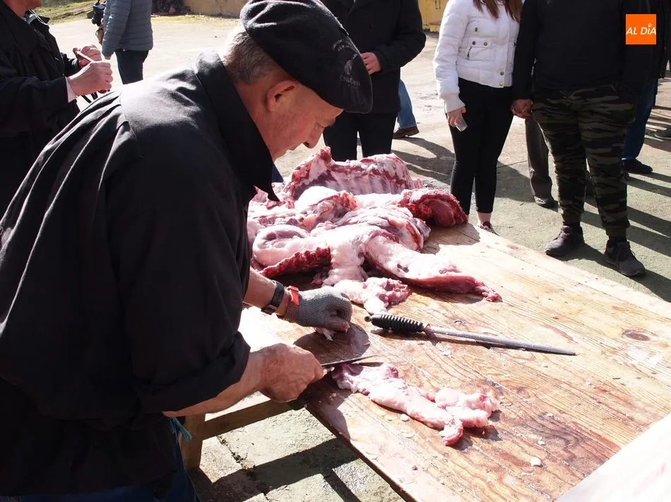 Tras el sacrificio del cochino, de 16 arrobas, tenía lugar su chamuscado con ramos de piornos, momento que daría paso a la limpieza del tocino antes de su posterior despiece. Con las vísceras fuera, llegaba el momento de abrir la canal y extraer el espinazo, para proseguir con costillas, lomos, paletas y jamones. Una a una fueron apareciendo piezas hasta hace muy poco desconocidas para el gran público: la cruceta, la bola, el secreto o el lagarto, todas ellas muy apreciadas, proceso que el maestro chacinero iba narrando a un público muy interesado en conocer el despiece del gorrino.