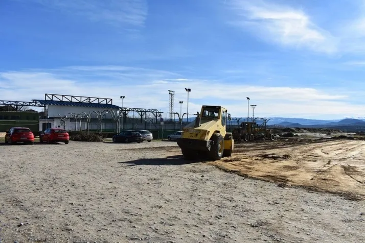 Los trabajos de asfaltado del aparcamiento del estadio Municipal han comenzado esta mañana. El Ayuntamiento acomete ya la mejora de la zona, hasta el momento una explanada de tierra que servía de aparcamiento para el campo de fútbol, las pistas de tenis y de acceso para el circuito de motocross.