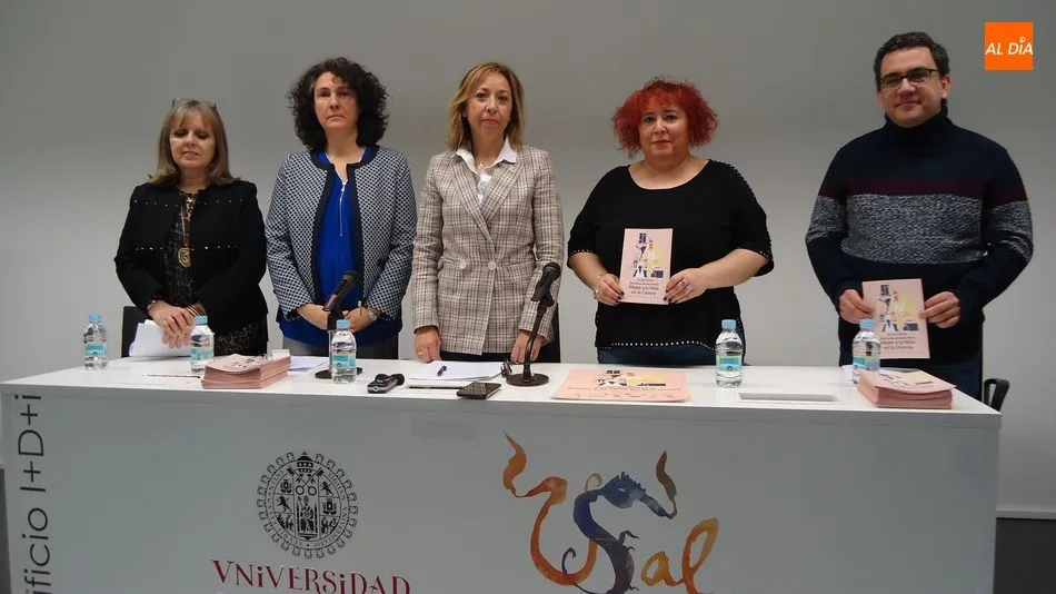 Junto a la vicerrectora de Investigación y Transferencia, en la presentación del programa han participado este lunes Mar Siles, delegada regional del CSIC, Inmaculada Sánchez Barrios, directora de la Unidad de Igualdad de la USAL, Marta del Pozo, directora del CEMUSA, y Miguel Battaner, técnico de la Unidad de Cultura Científica y de la Innovación.