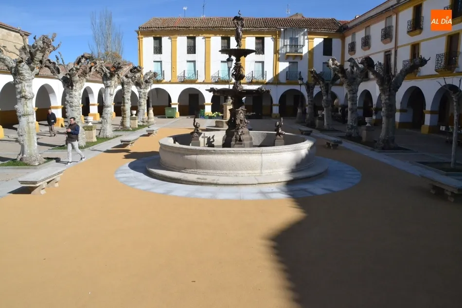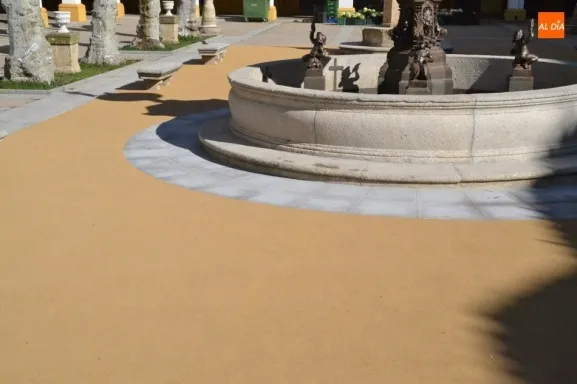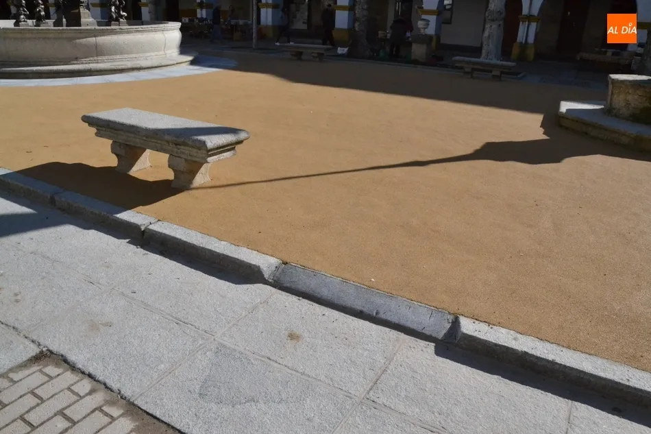 El tradicional Mercado de frutas y verduras que se despliega cada semana por la Plazuela del Buen Alcalde de Ciudad Rodrigo tuvo en su sesión de esta semana una novedad, referente al escenario donde se desarrolla: tras cuatro semanas de obras, por fin ya se ha completado la operación de sustitución del suelo de su zona central, de donde se ha retirado la arena para dar paso a un pavimento continuo de caucho de un color también arenoso.