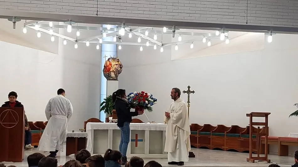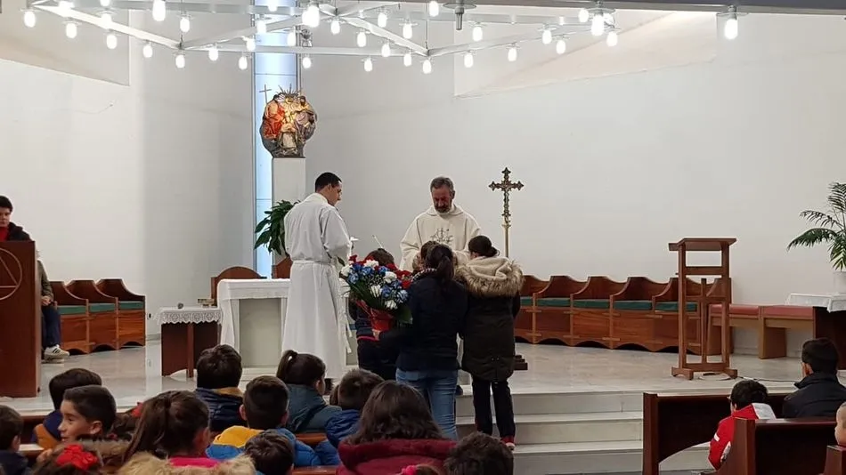 En primer lugar han participado en una eucaristía en la parroquia y al terminar salieron a realizar la ofrenda floral por parte de la AMPA a la estatua del santo que está enfrente de la iglesia.
