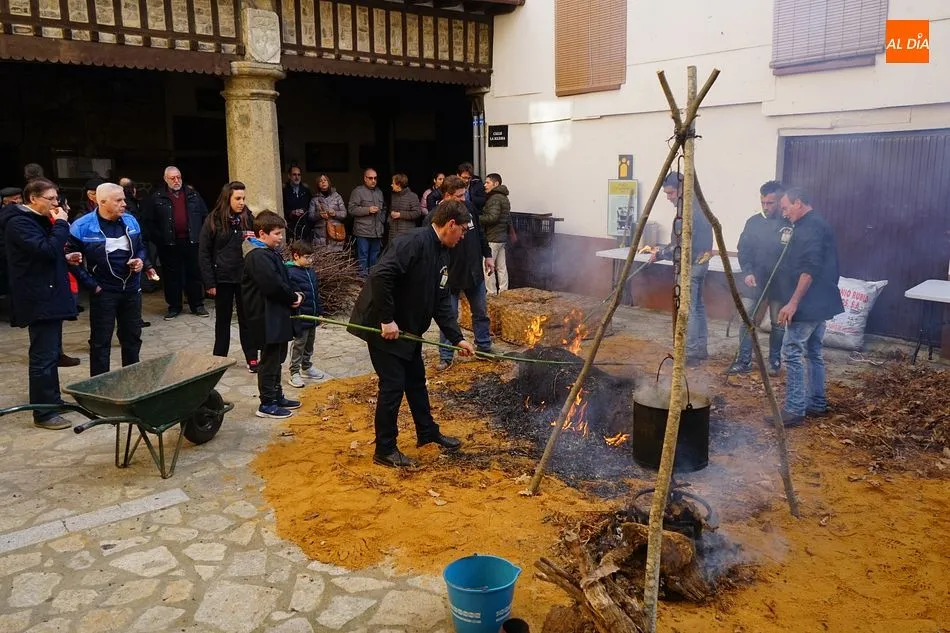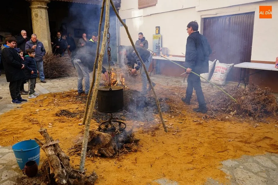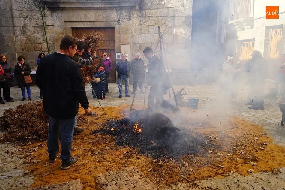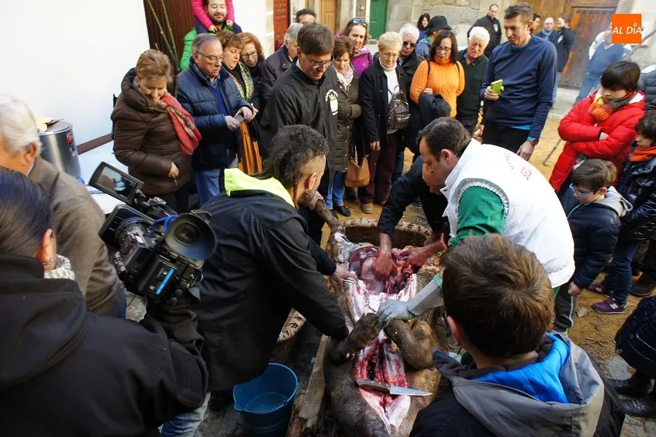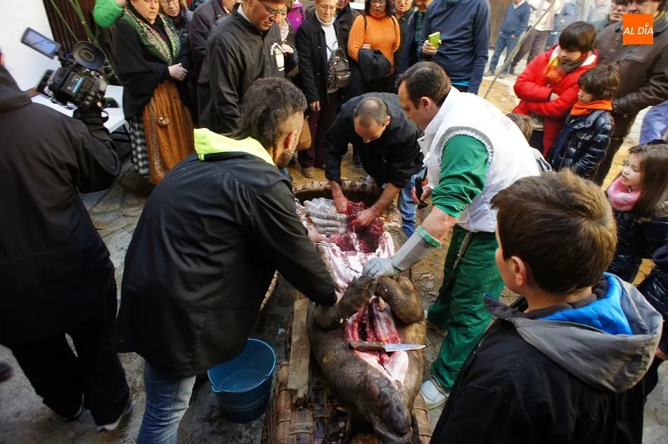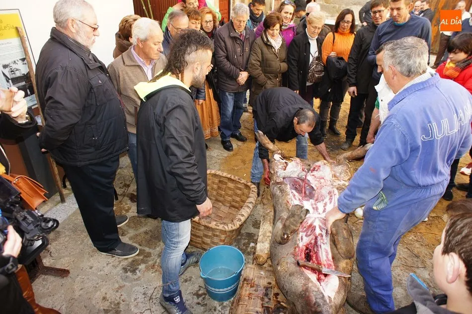 Con un tiempo envidiable, y con el solano de la iglesia prácticamente lleno, se procedió al pesaje del cerdo, que llegó hasta las 17 arrobas, y el inicio de las tareas de chamuscado, despiece y clasificación. Como en todas las fiestas de la matanza del circuito de la Diputación, se contó con la presencia de animadores que invitaban a los visitantes a participar, ya fuera adivinando el peso del cerdo o contando detalles sobre el proceso chacinero.