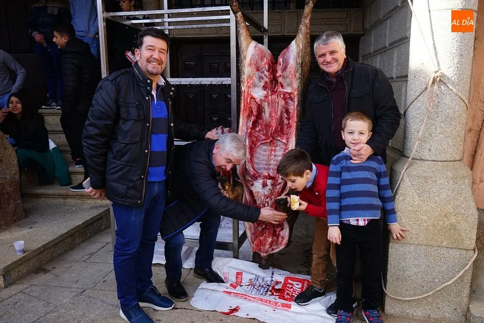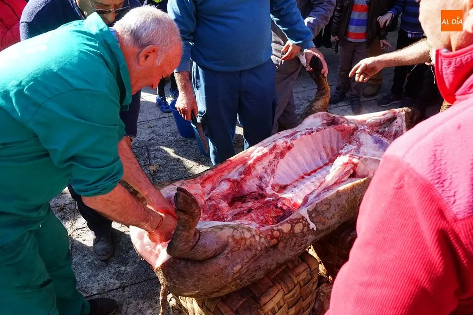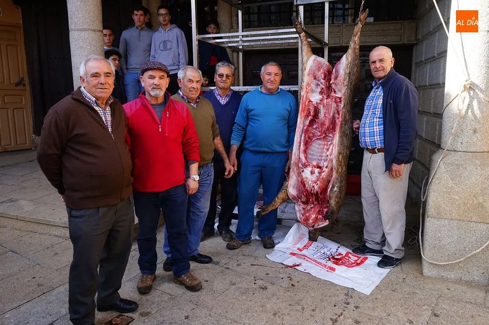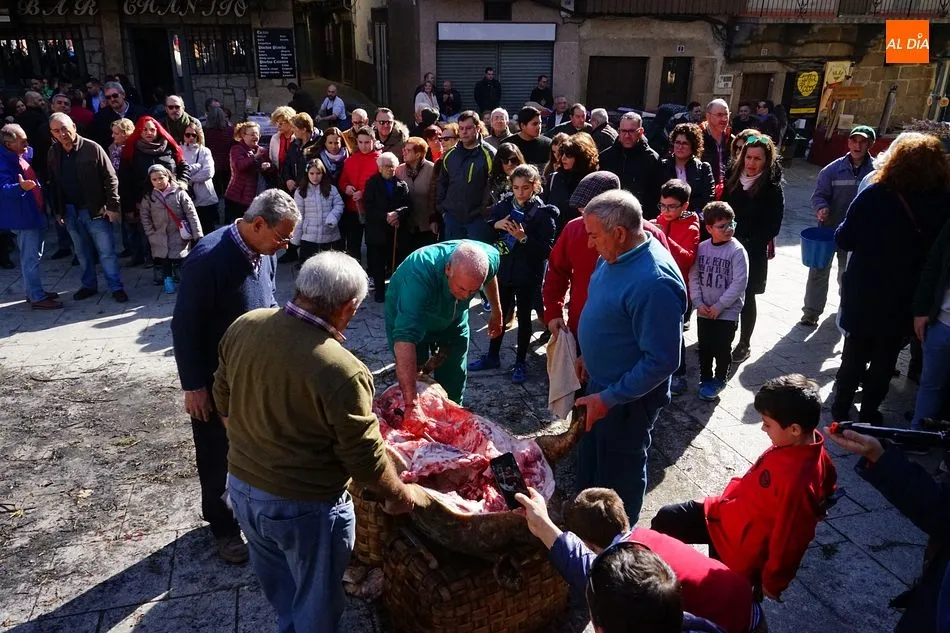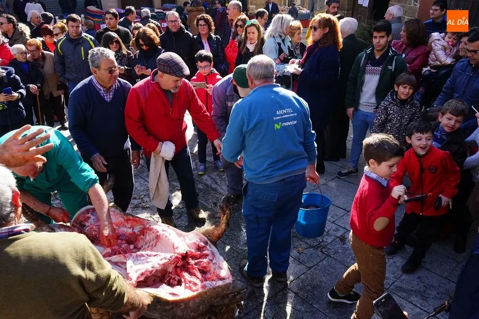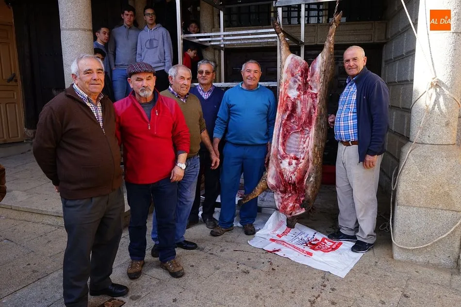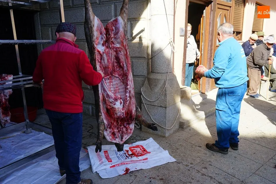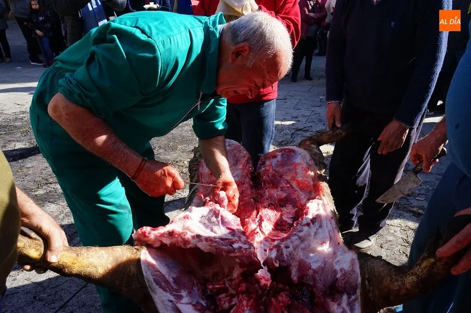No faltó la música de la gaita y el tamboril, además de los miembros de la agrupación de mayores, quienes se encargaron del sacrificio del animal y su posterior despiece en la plaza ante el numeroso público a manos de Genaro López, José Luis Salgado, José Antonio Domínguez, Carlos Barrio y Fernando Hernández, matarifes de una multitudinaria jornada que convierte la localidad en toda una fiesta.