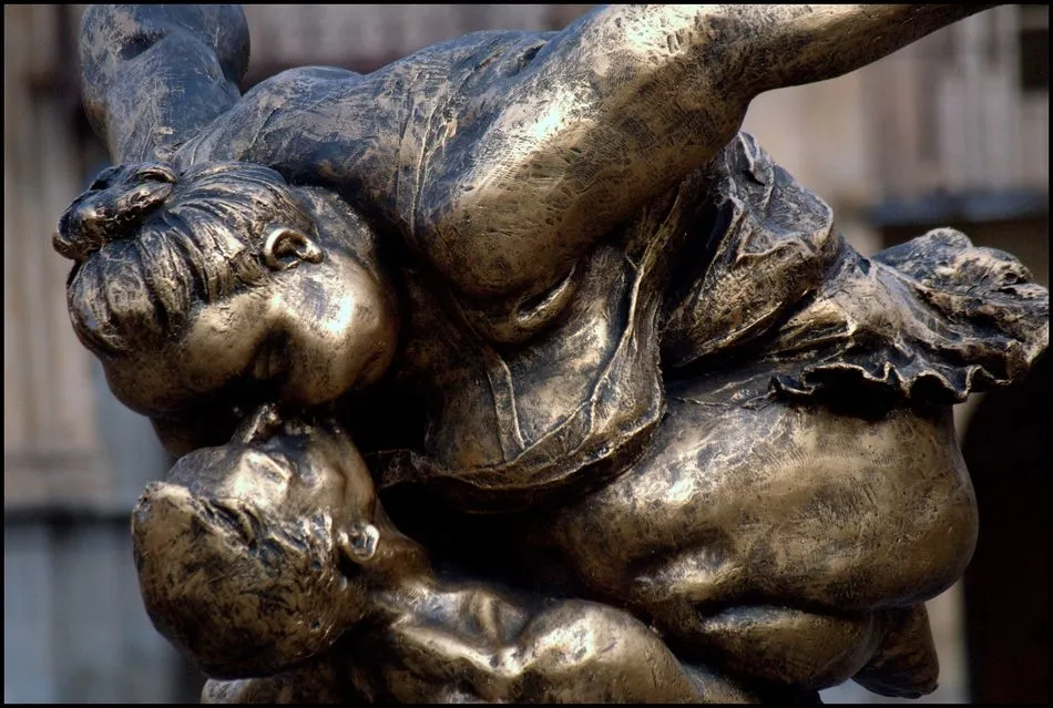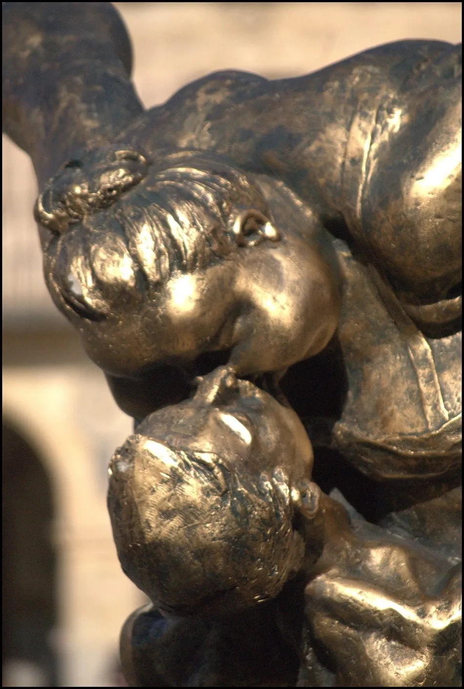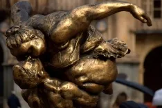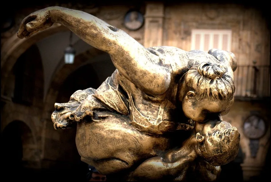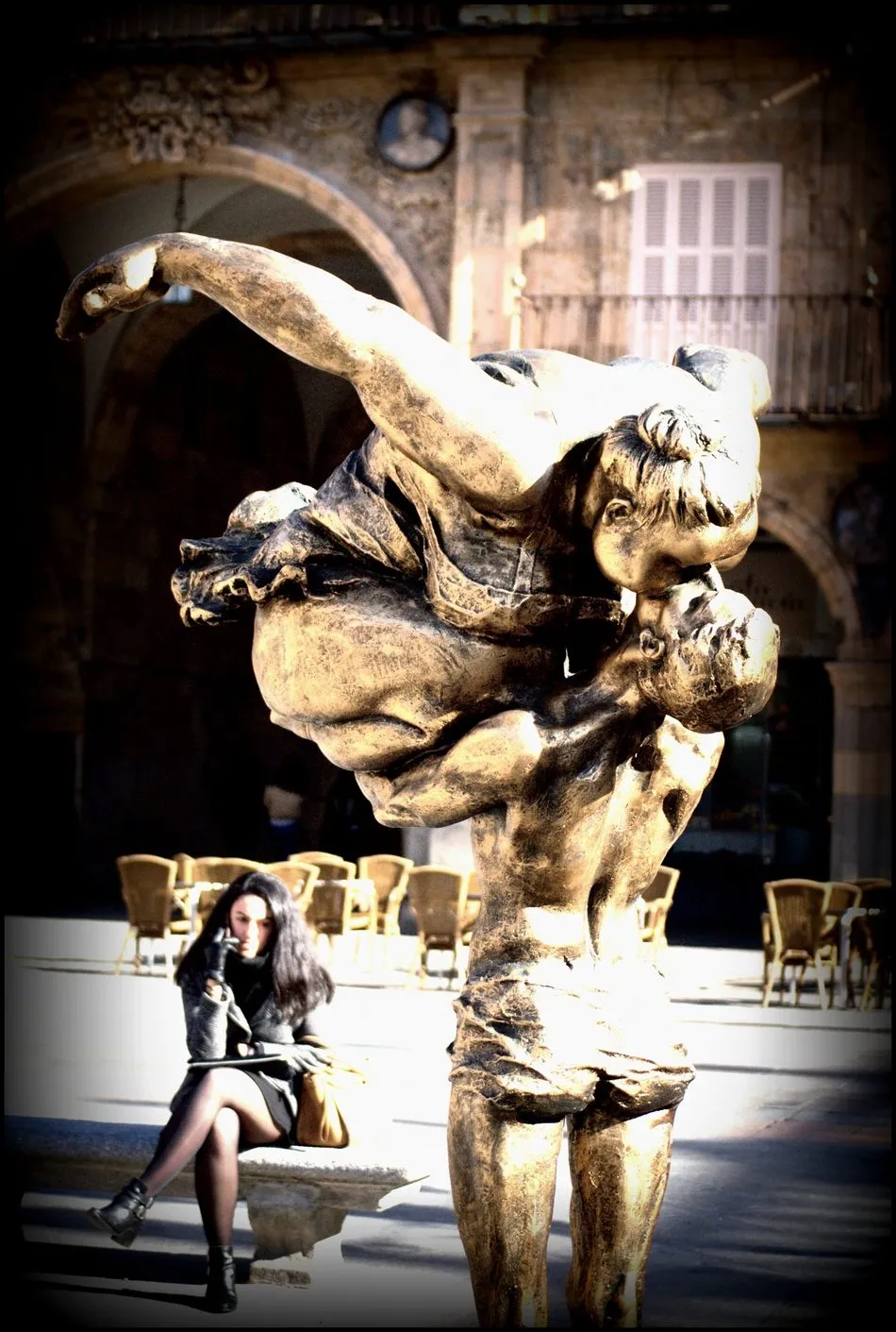 Me van a permitir que les confiese que a mí la escultura del insigne artista, a pesar de haberse recorrido 30 ciudades europeas me tiene intrigada, no sé si me gusta o me disgusta y confío que semejante despliegue al menos sea correspondido por los chinos en forma de intercambios comerciales. Total, festejamos el año del cerdo y nada mejor que hacerlo en Guijuelo, una se ha vuelto práctica y estoy dispuesta, por más contratos y menos bazares, incluso a poner una de esas sílfides en mi propio pasillo si es que caben. Y como lo sorprendente anima la tertulia, me tomo un vino con gusto y mucha gracia con Amador Martín y José María Sánchez Terrones quien ya tiene título para la antítesis que decora la Plaza Mayor de todos los salmantinos. Sí, esa Plaza que unos quieren con libros y otros desnuda de toda página, pero abierta a desmanes tales como la Nochevieja Universitaria. A Terrones no le falta ni gracia ni sabiduría, por eso se solaza en que el amor puede con todo para describir el peso que no pesa, o dicho al modo de Xu Hongfei, la bella gorda que sostiene el enamorado raquítico en un alarde de equilibrio que ríete tú del quevedesco elefante bocabajo de Barceló. El amor puede con todo y es paciente y generoso como decía San Pablo en esa carta tan poética que leen en todas las Bodas, un amor hercúleo a pesar de la endeblez de las piernas del enamorado que sostiene, besa y equilibra a su mastodóntica pareja de baile. Y ya puedes hacer chistes sobre la diferencia de edad, que aquí lo más importante, es la diferencia de volumen.