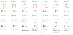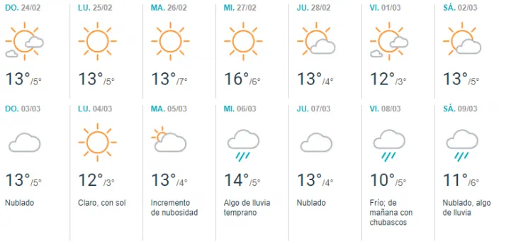 Tal y como se puede ver en la imagen superior, el Carnaval arrancaría el Viernes con una jornada de sol y nubes, algo que se repetiría el Sábado. El Domingo de Carnaval el cielo estaría nublado, en contraposición con el sol que luciría el Lunes. Para acabar, el Martes sería una jornada de nubosidad creciente, que daría paso a la lluvia en las jornadas siguientes.