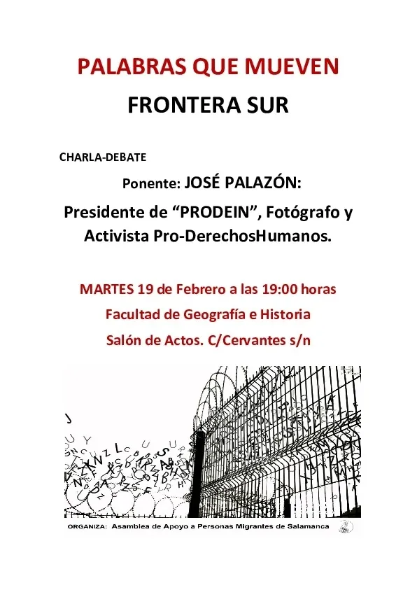 La Facultad de Geografía e Historia acoge el próximo martes, 19 de febrero, una charla debate sobre migración que contará con José Palazón. La actividad, que lleva por título 'Palabras que mueven, frontera sur', comenzará a las 19:00 horas.