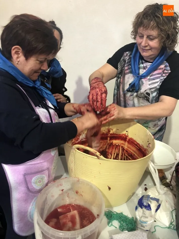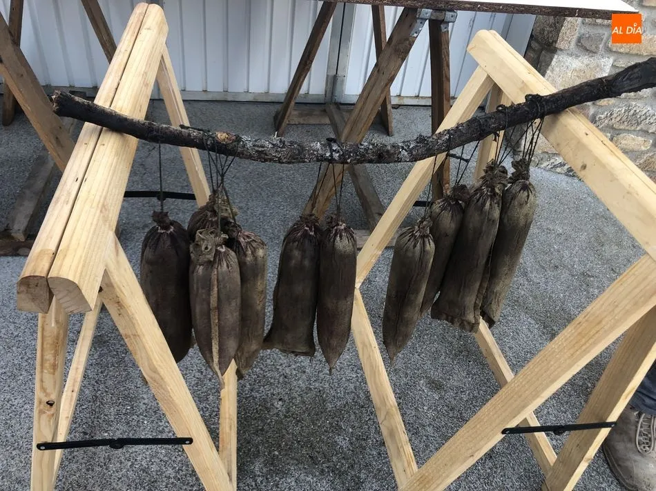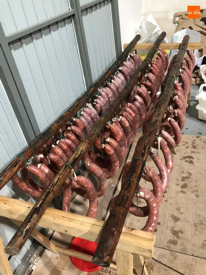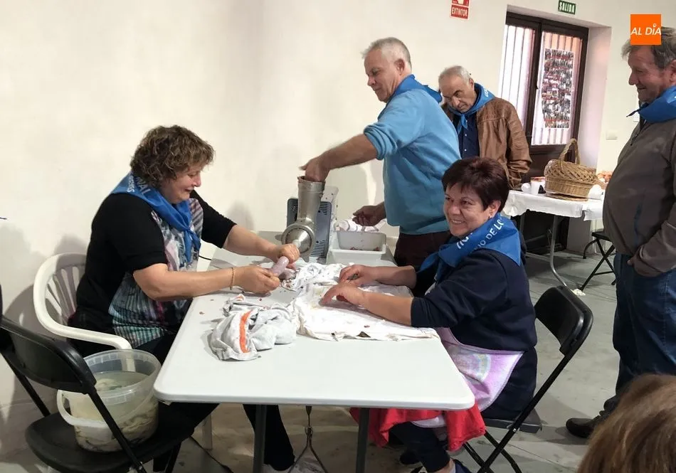 Ya por la tarde, se elaboraban los embutidos de chorizos, salchichones y morcillas, en la que todos los presentes de una u otra forma colaboraban en la tarea, al igual que en los distintos pasos de la matanza pues se trata de una jornada organizada y sufragada por los propios asistentes.