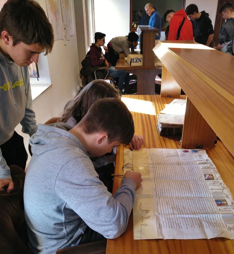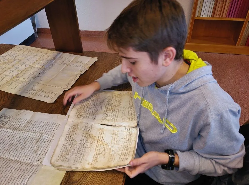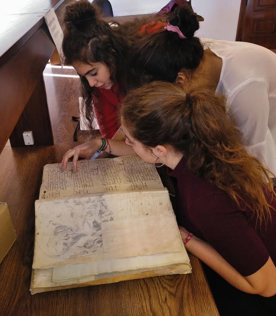 Los directores, muy amablemente, permitieron a los alumnos consultar una muestra de los distintos tipos de documentos que custodia el archivo, fechados desde el siglo XII al XIX. Así descubrieron que, para leer los pergaminos medievales, como las bulas, hay que saber latín y paleografía, mientras que para los textos de principios de la Edad Moderna basta con conocer las abreviaturas, aunque hace falta mucha práctica porque la caligrafía es distinta a la actual.