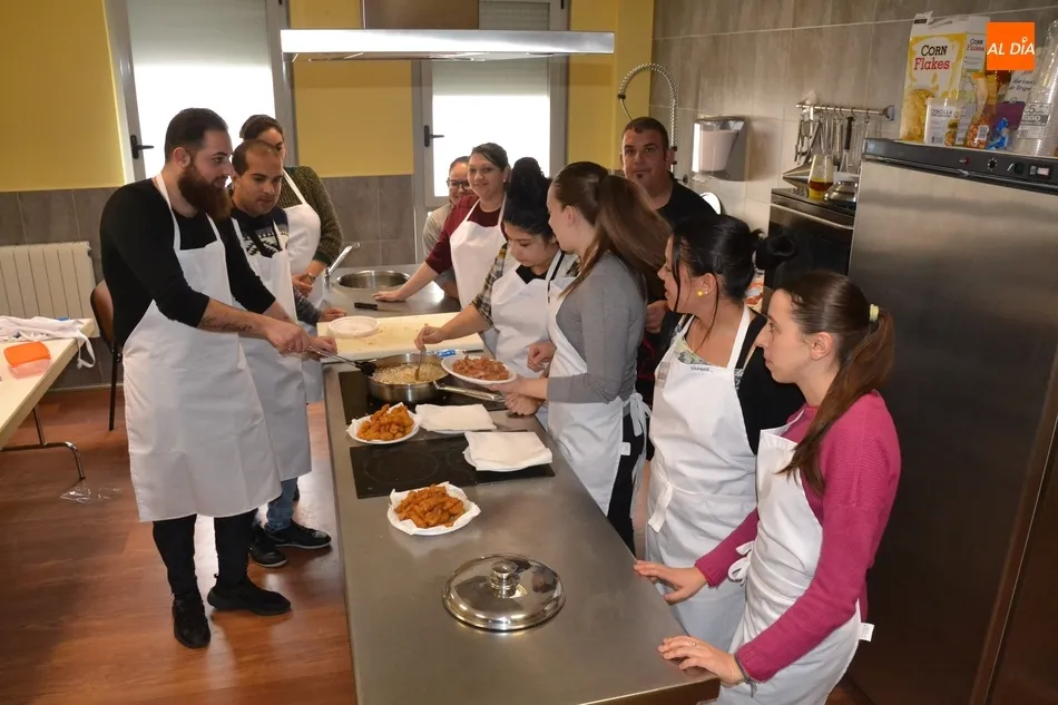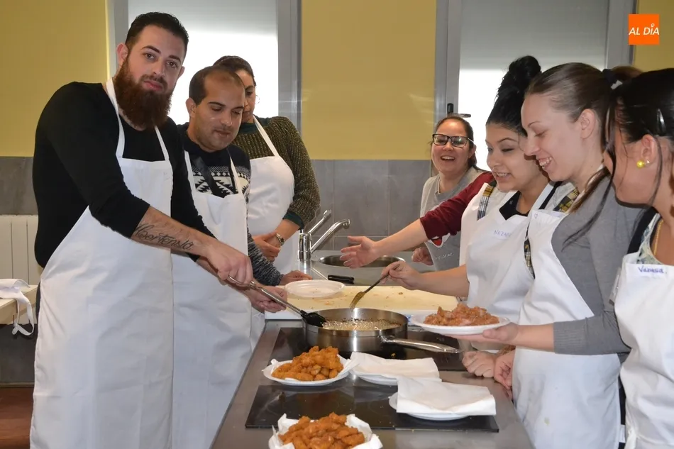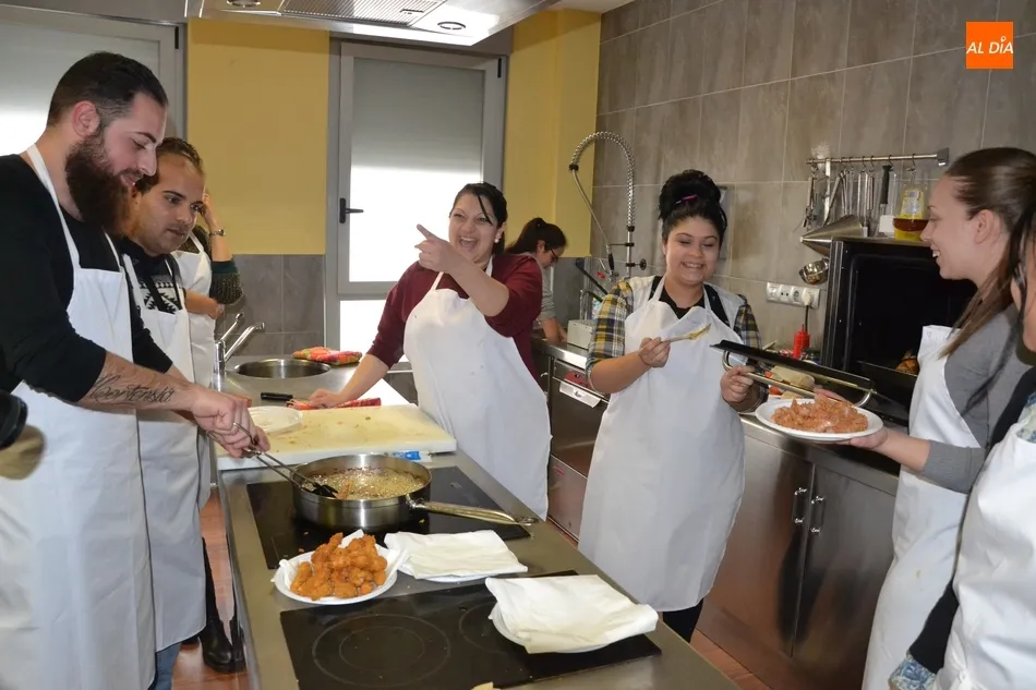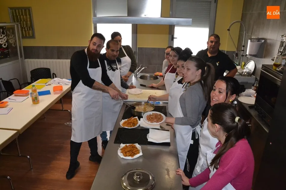 Una docena de alumnos -la práctica totalidad de ellos jóvenes- están participando en unos talleres de cocina puestos en marcha por la Asamblea Comarcal de Cruz Roja en Ciudad Rodrigo dentro de su Proyecto de Empleo. En la mañana del martes, estos alumnos estuvieron cocinando en el Espacio i, bajo la dirección de David Aparicio (de Paellas Gigantes David), pollo relleno y fondees de pollo con diferentes rebozados. El Proyecto se prolongará hasta el mes de abril.