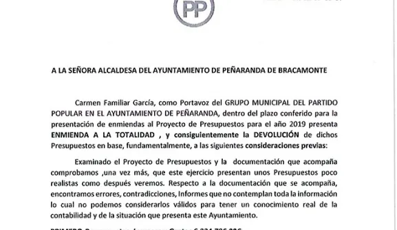 El Grupo Popular en el Ayuntamiento de Peñaranda ha registrado este lunes en las oficinas municipales el documento con el argumentario a través del cual se desarrolla la enmienda a la totalidad de los Presupuestos 2019 presentados por el Equipo de Gobierno socialista.