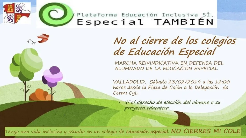 La Plataforma ?Educación Inclusiva Sí, Especial también? ha organizado una marcha reivindicativa, el próximo sábado en Valladolid, en defensa del alumnado de la Educación especial y para rechazar el cierre de los colegios de Educacuón especial. La marcha partirá a las 12.00 horas desde la Plaza de Colón hasta la Delegación de Cermi Castilla y León.