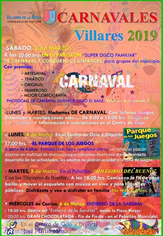 El Ayuntamiento de Villares de la Reina, a través del Área de Cultura, organiza como es habitual en las fechas de Carnaval, un completo y variado programa de actividades para la participación de todos los vecinos, y en especial de los más pequeños, sus familias y los jóvenes de las peñas, que tendrán lugar en el Centro de Ocio y Deporte.
