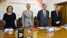 En la presentación del volumen, que tuvo lugar esta mañana en el Rectorado de la Universidad de Salamanca, estuvieron presentes el rector Ricardo Rivero y el presidente de Patrimonio Nacional, Alfredo Pérez de Armiñán y de la Serna, quienes estuvieron acompañados por Pilar Martín-Laborda, vocal asesora de Programas Culturales de Patrimonio Nacional; Román Álvarez, delegado del rector para las Relaciones con Patrimonio Nacional; Efrem Yildiz Sadak, vicerrector de Relaciones Internacionales de la USAL; y Pilar Jiménez Tello, vicesecretaria general de la Universidad.