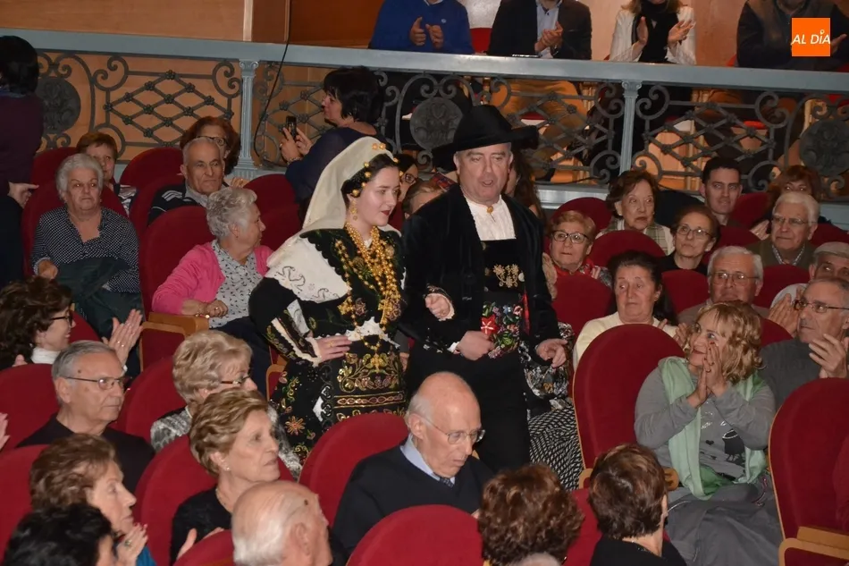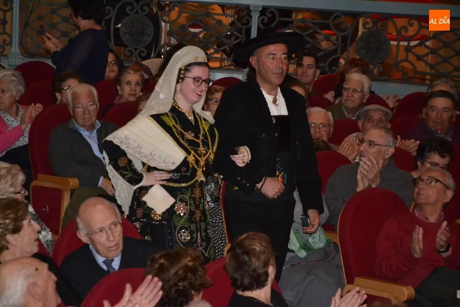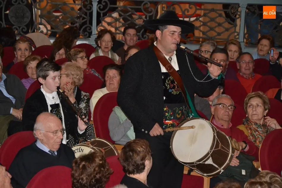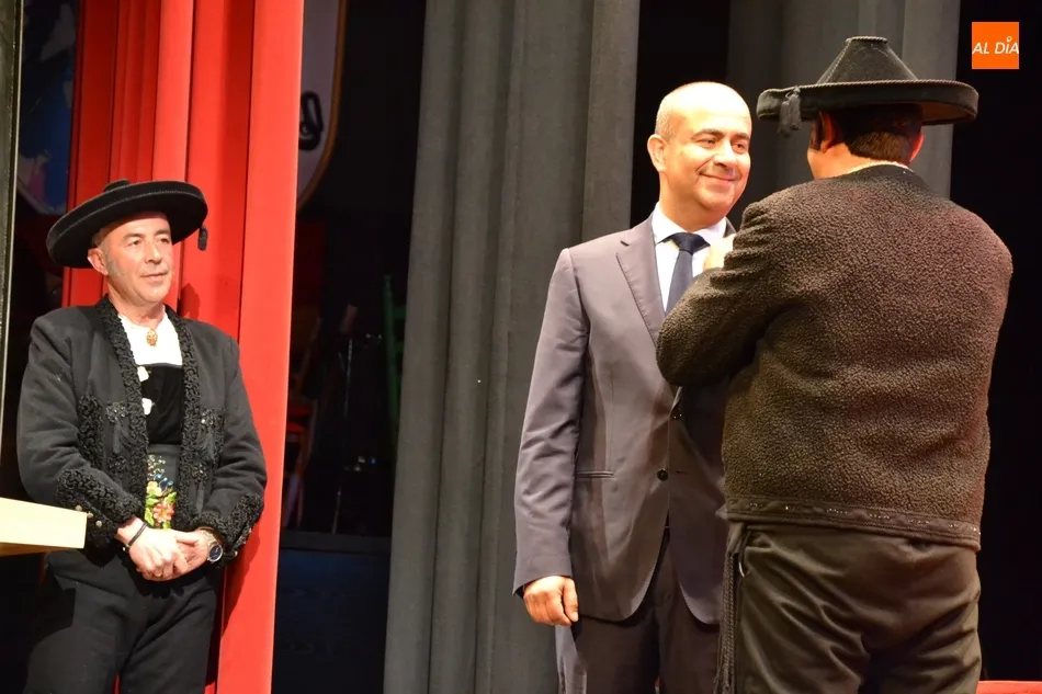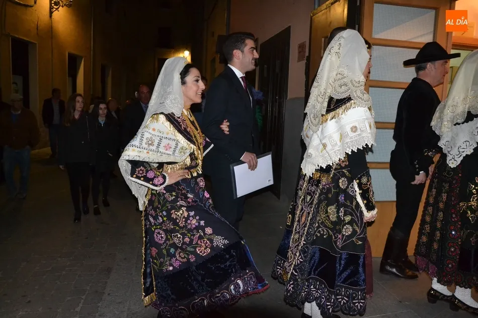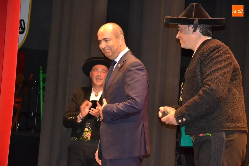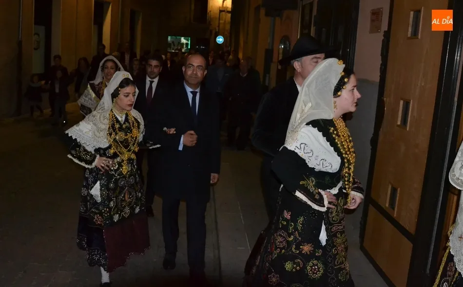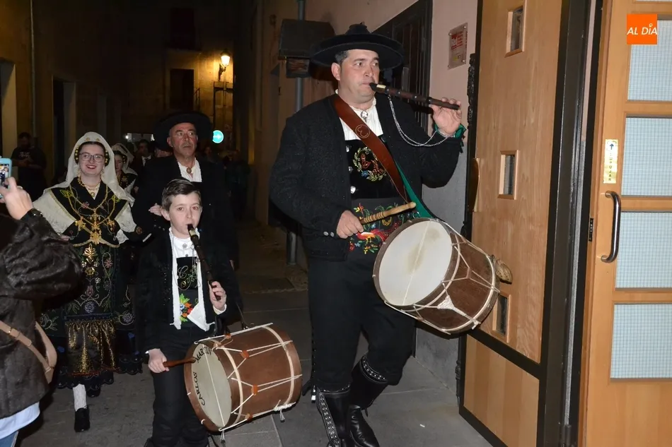 Alberto Galán desvela anécdotas personales a la par que anima a defender el encierro a caballo   | Imagen 1La velada de la Asociación Charra del Caballo había arrancado en el Restaurante Tamborino II, donde se puso en marcha el cortejo en dirección al Teatro Nuevo. De esta comitiva participaron, además del pregonero y de miembros de la Asociación, varias mujeres ataviadas con el traje charro (de la Asociación El Botón Charro de Miróbriga) y dos tamborileros.