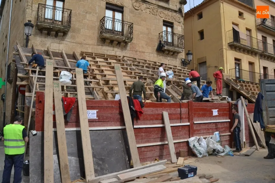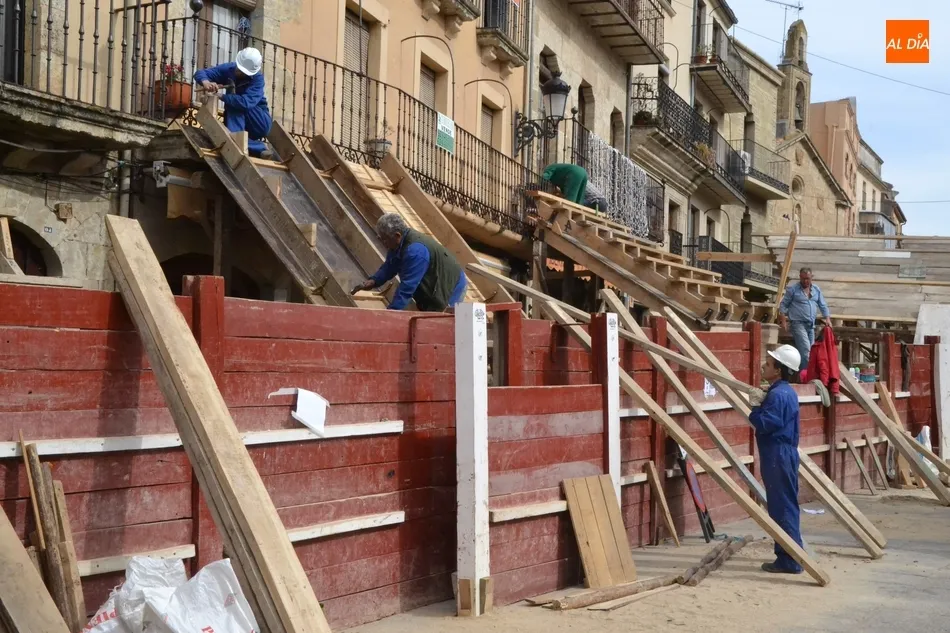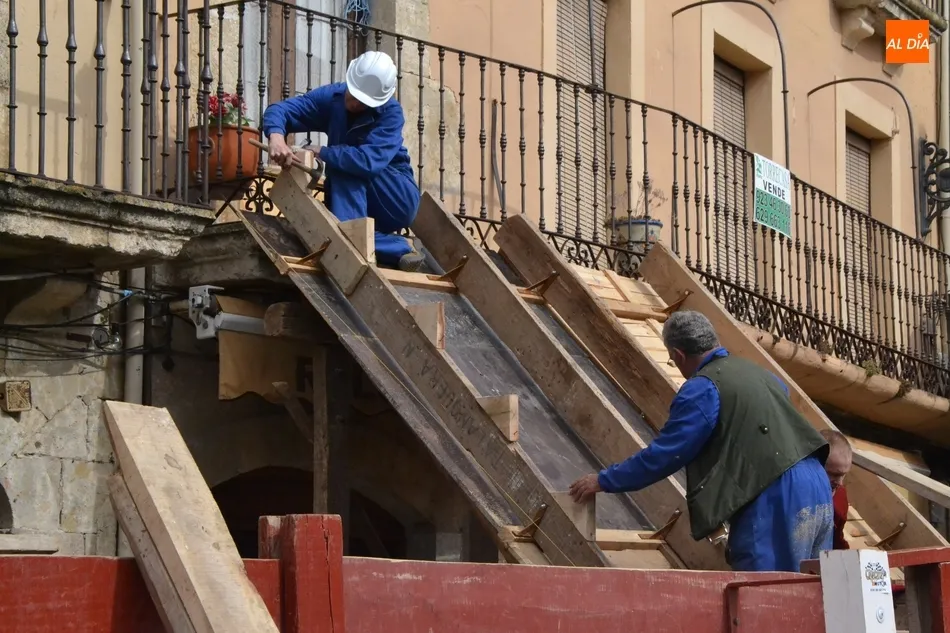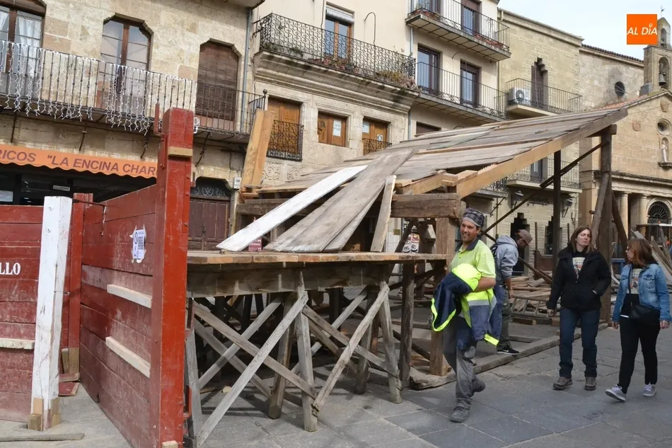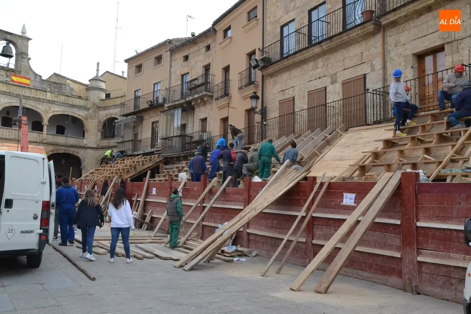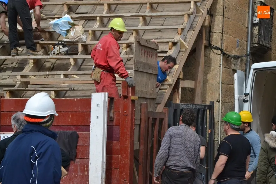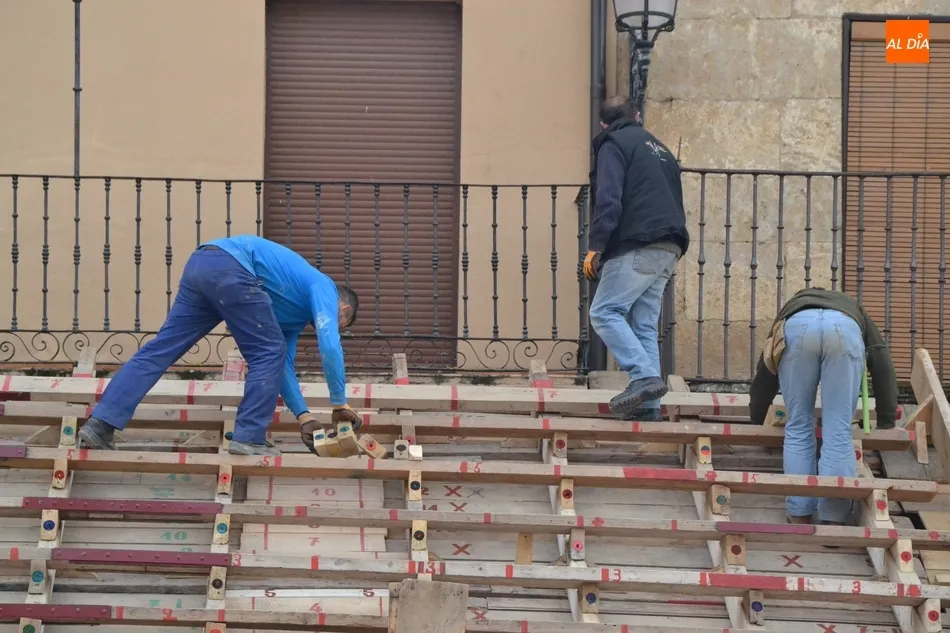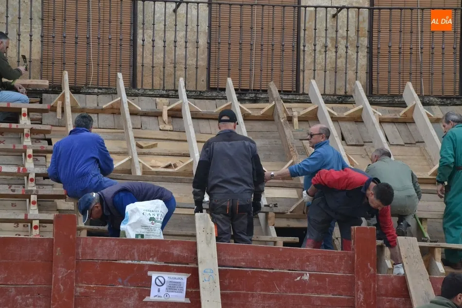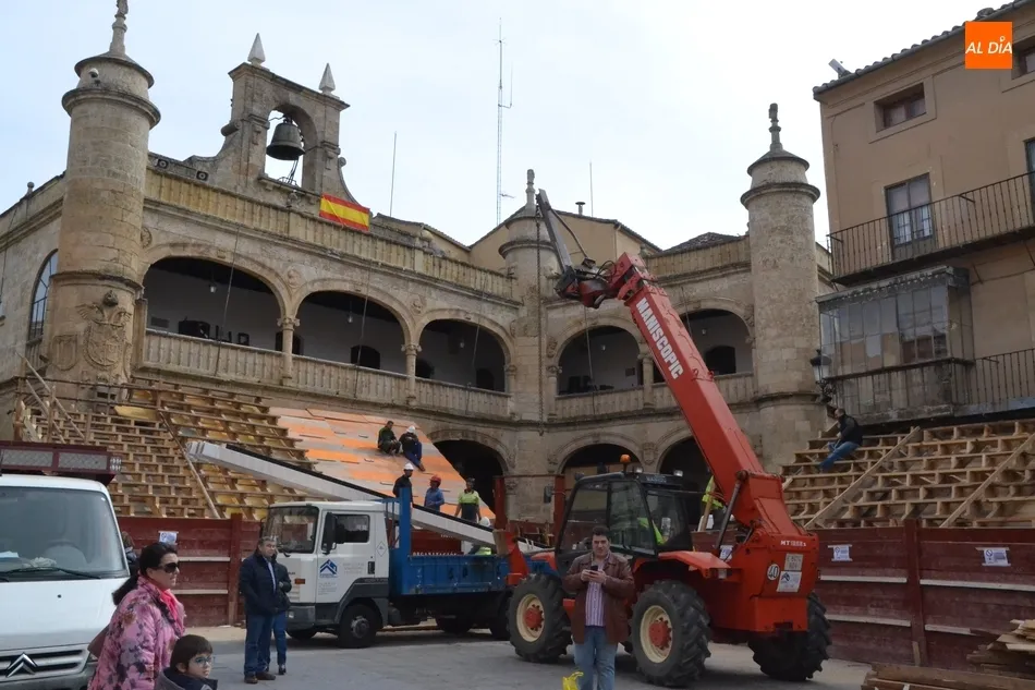 La Plaza Mayor de Ciudad Rodrigo continúa transformándose, minuto a minuto y hora a hora, en un espectacular coso taurino, en una tremenda obra de ingeniería artesanal que a lo largo de este fin de semana precarnavalero causa la admiración de los cientos y cientos de personas, tanto mirobrigenses como forasteros, que se asoman por el ágora.