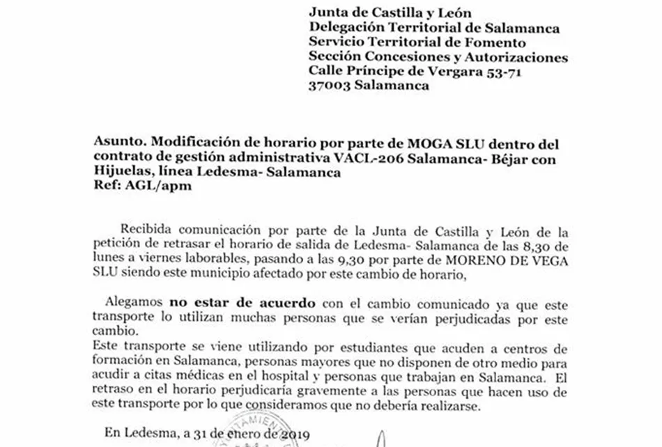 De hecho, tal y como ha comunicado el Ayuntamiento de Ledesma, tras recibir la comunicación de la modificación de horario se presentaron las correspondientes alegaciones. Escrito que fue remitido al Servicio Territorial de Fomento, sección de Concesiones y Autorizaciones, con fecha del pasado 31 de enero. ?A día de hoy, la Junta de Castilla y León no ha enviado comunicado oficial al Consistorio ledesmino?.