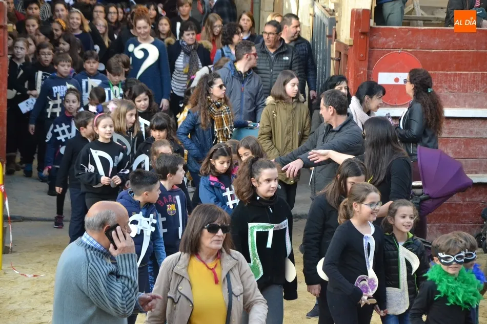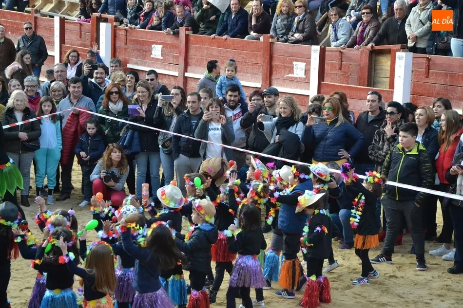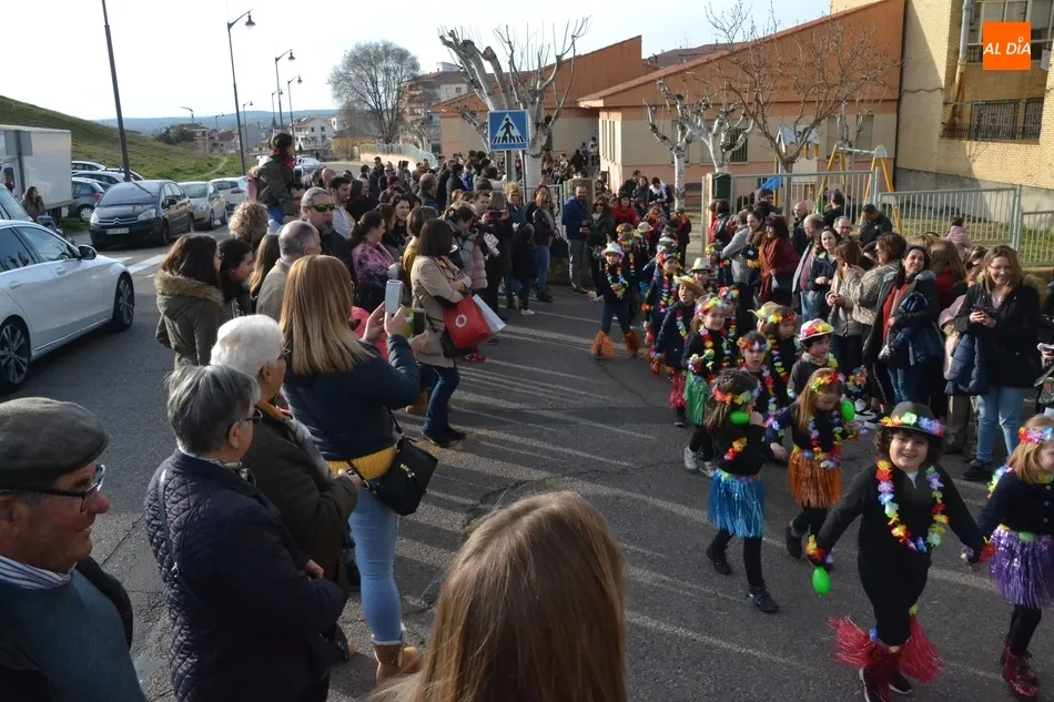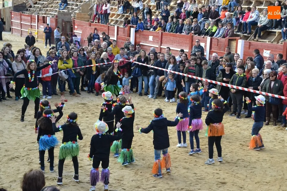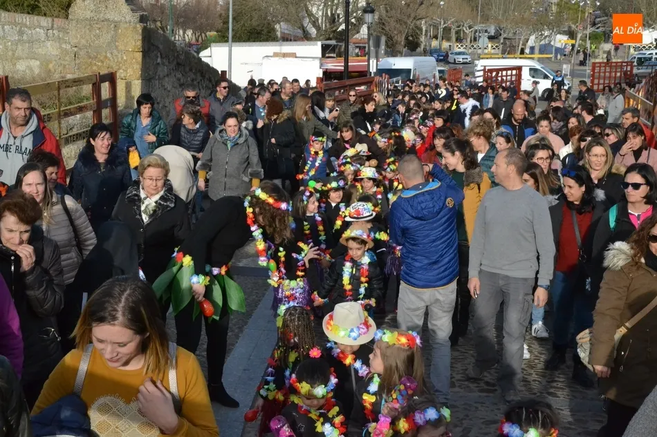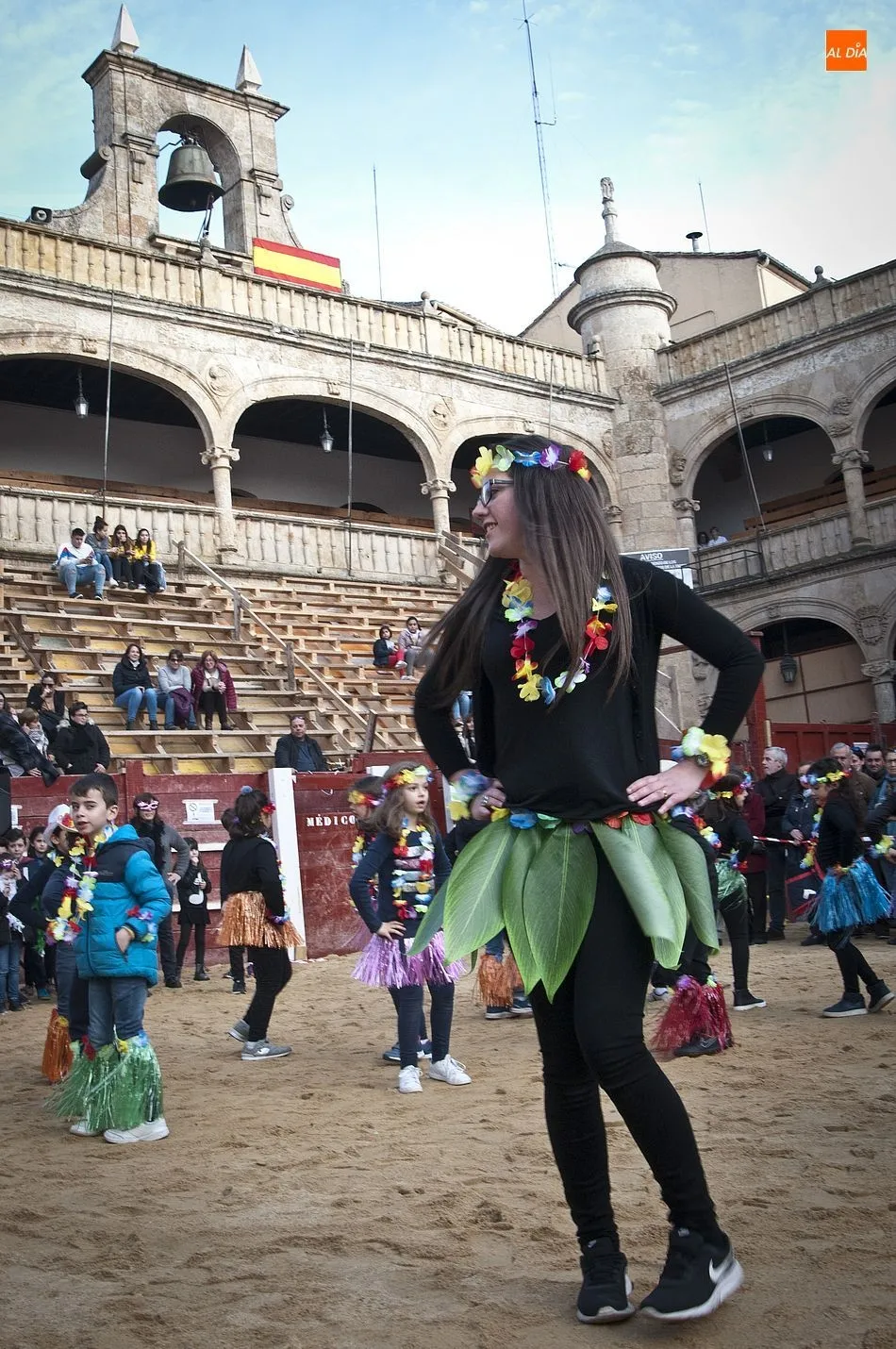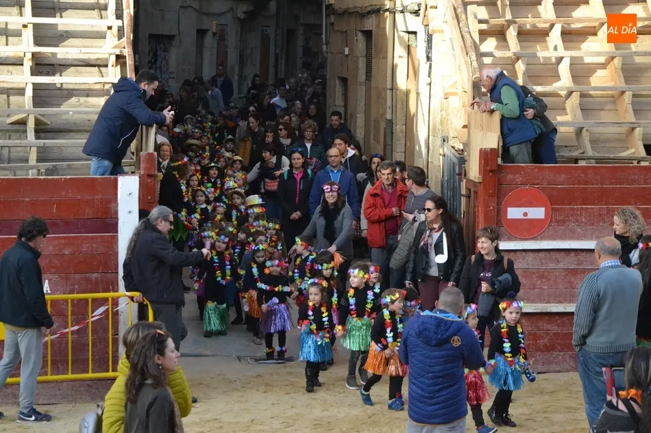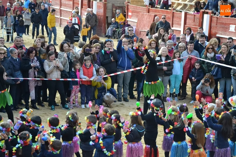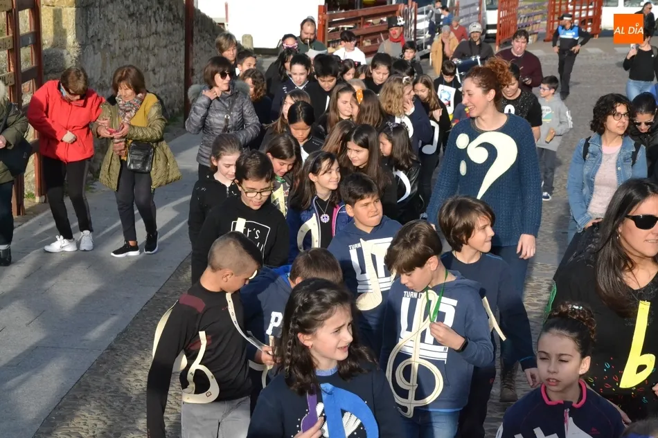 Una vez en la Plaza Mayor, se produjo la unión del Carnaval mirobrigense con el resto a través de la música, bailando cada uno de los grupos de niños con los que cuenta la Escuela una canción alusiva a la indumentaria que llevaban. Gracias a ello, en la Plaza Mayor se pudieron escuchar, por ejemplo, los mismos ritmos que están sonando en Río de Janeiro durante estos mismos días.