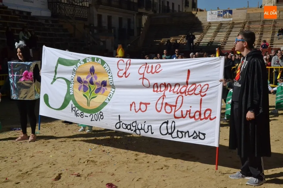 A continuación, fue turno para que hiciese acto de presencia en la Plaza en la soleada mañana del Viernes el Colegio Misioneras de la Providencia-Santa Teresa de Jesús, que este año ha dedicado su pasacalles al 50 aniversario que está cumpliendo el propio Colegio Misioneras, como se reflejaba en la pancarta de apertura, que recogía asimismo la leyenda El que aprende no olvida.