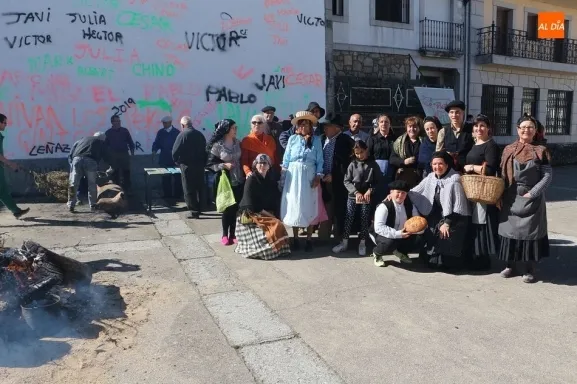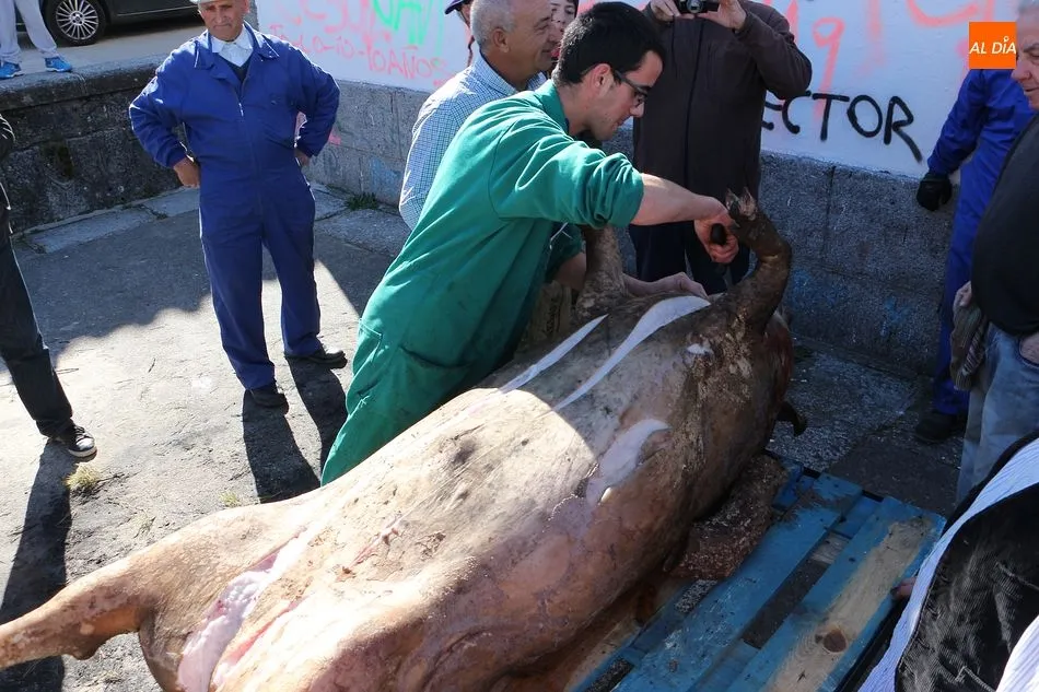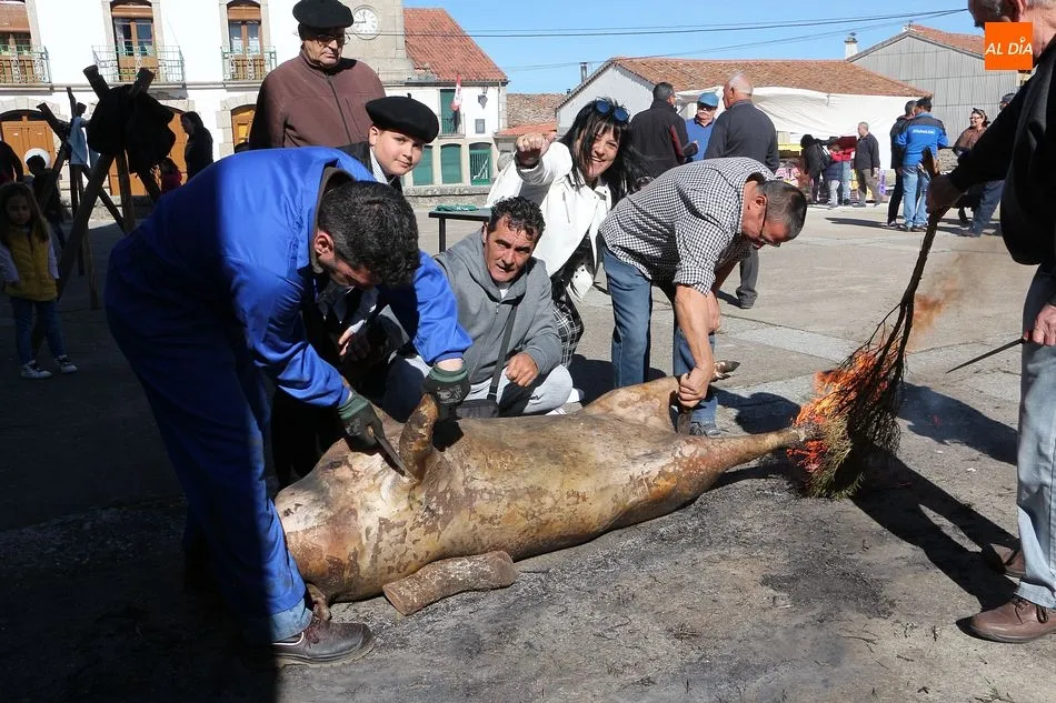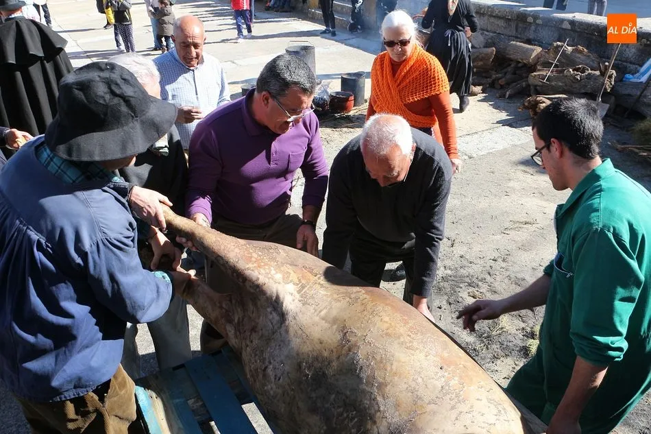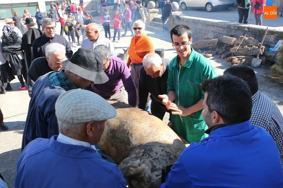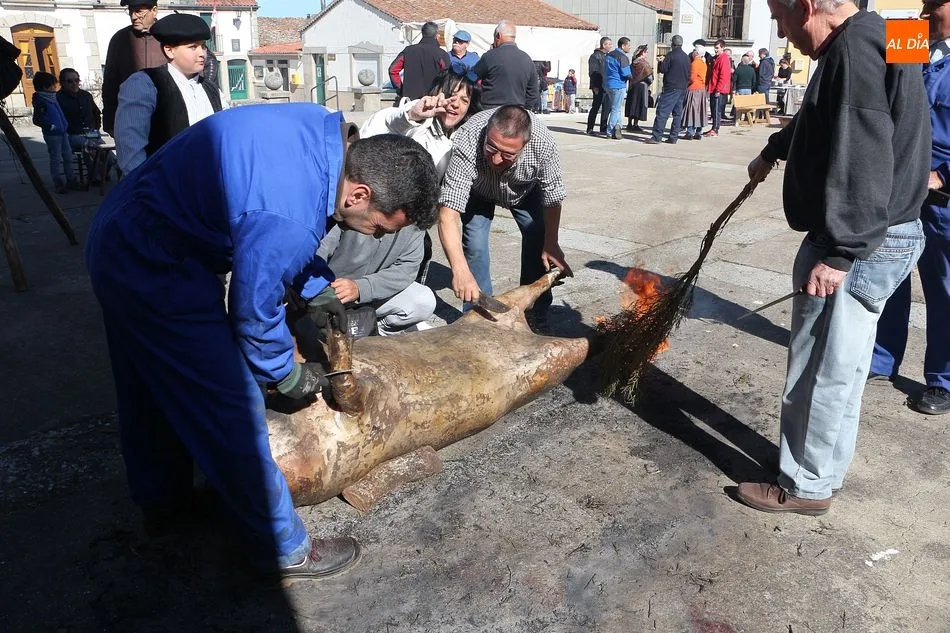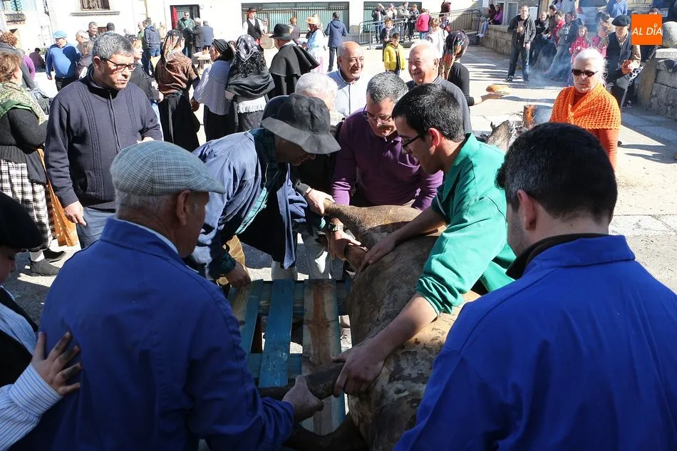 Los Santos vivió hoy una nueva edición de su matanza típica que ha invitado a los vecinos a disfrutar de esta cita tradicional en la Plaza Mayor. A mediodía se fueron reuniendo los vecinos en el ágora y se procedió al despiece del animal que llegó a la plaza ya sacrificado, tal y como manda la legislación, y los matarifes locales y las voluntarias de la asociación Corral de Concejo se pusieron manos a la obra. Tras el chamuscado, y con la animación de Cateja Teatro se avanzó en la fiesta, en la que no faltó la música de la gaita y el tamboril para que se animaran algunos de los presentes con bailes tradicionales como el de la botella. Se celebró la subasta del peso del animal, que marcó 180 kilos, destinándose lo recaudado a la beneficio de la Asociación. Al igual que el año pasado, el evento forma parte del circuito provincial de matanzas de la Diputación de Salamanca.