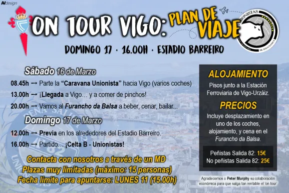 Aún no se ha jugado el partido de este sábado que enfrenta a Unionistas contra el Internacional de Madrid, pero la Peña Salida 82 ya está preparando el viaje del fin de semana siguiente a Vigo. Unionistas se mide el domingo 17 de marzo al Celta B (16:00 horas) y esta peña del club charro ha organizado un plan de viaje para todo el fin de semana.